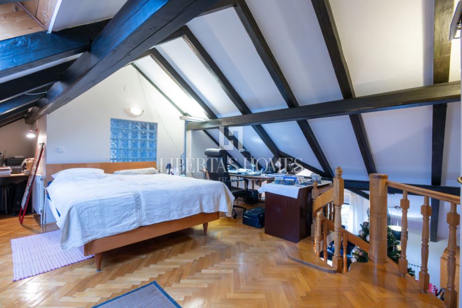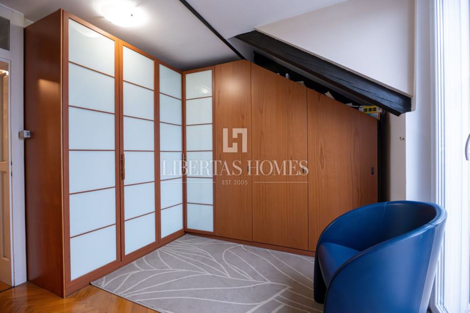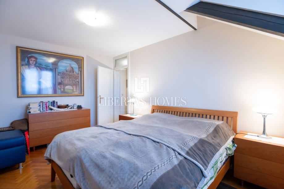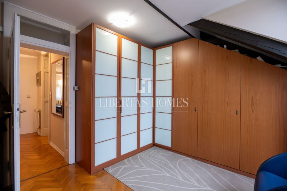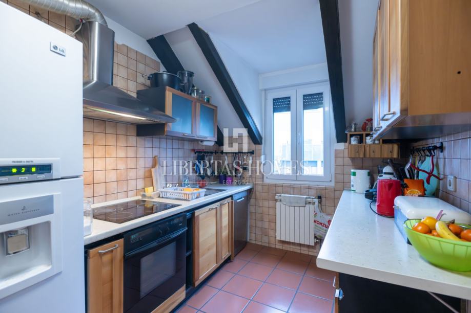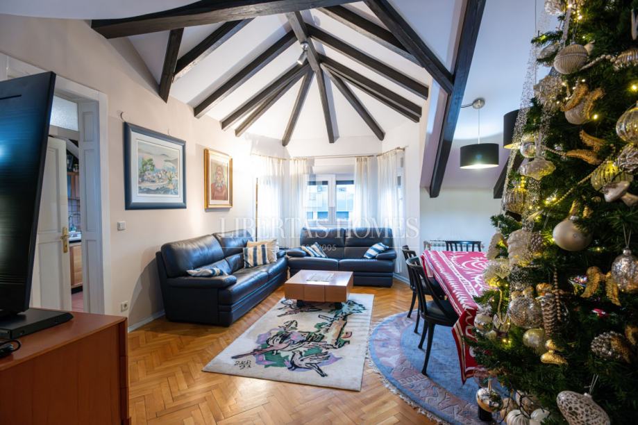 Središnji dio stana čini prostrani dnevni boravak s visokim stropovima koji se protežu do krovnih greda, stvarajući dojam prostranosti i elegancije. Uz dnevni boravak, stan uključuje kuhinju s izbom, dvije sobe, kupaonicu te dodatni prostor na galeriji koji se koristi kao spavaća i radna soba sa zasebnim WC-om. Stan je zasebno etažiran, pružajući potpunu privatnost.