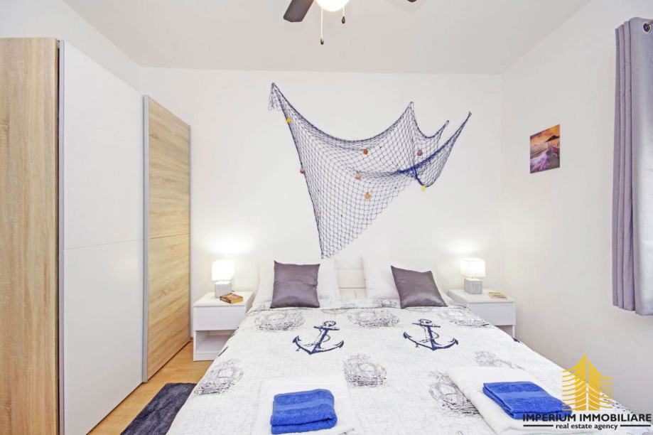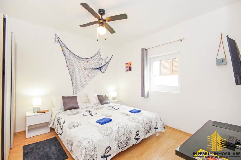 Kuća se sastoji od tri potpuno odvojene stambene jedinice, svaka sa svojim privatnim ulazom, dok terasa na trećoj etaži nudi spektakularan pogled na more i okolna naselja. Apartmani su klimatizirani, potpuno opremljeni i spremni za korištenje.