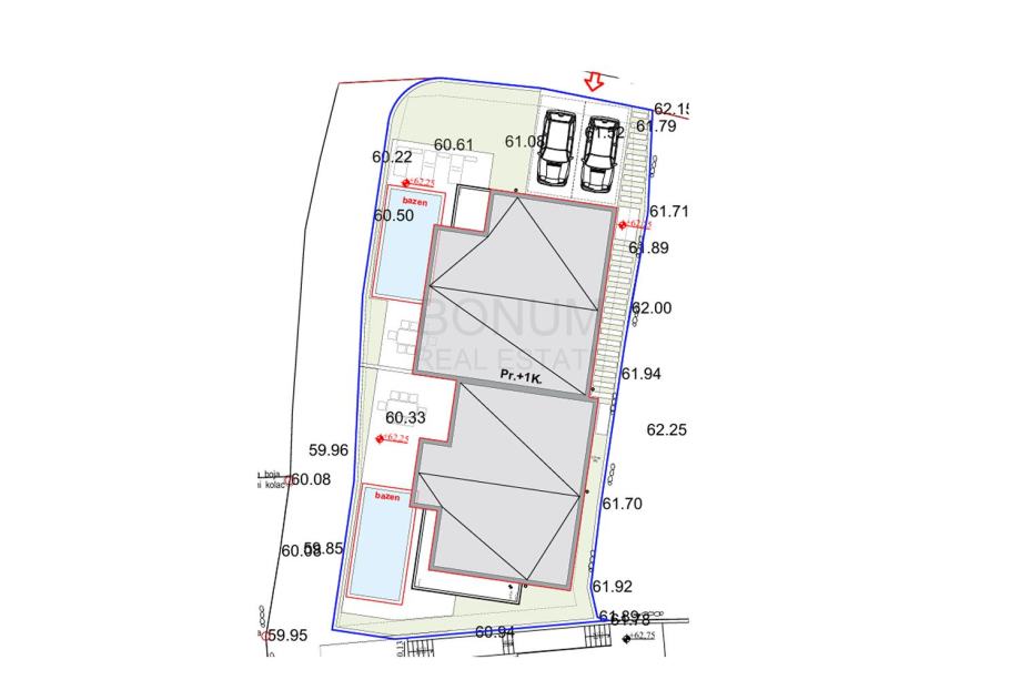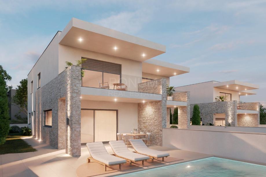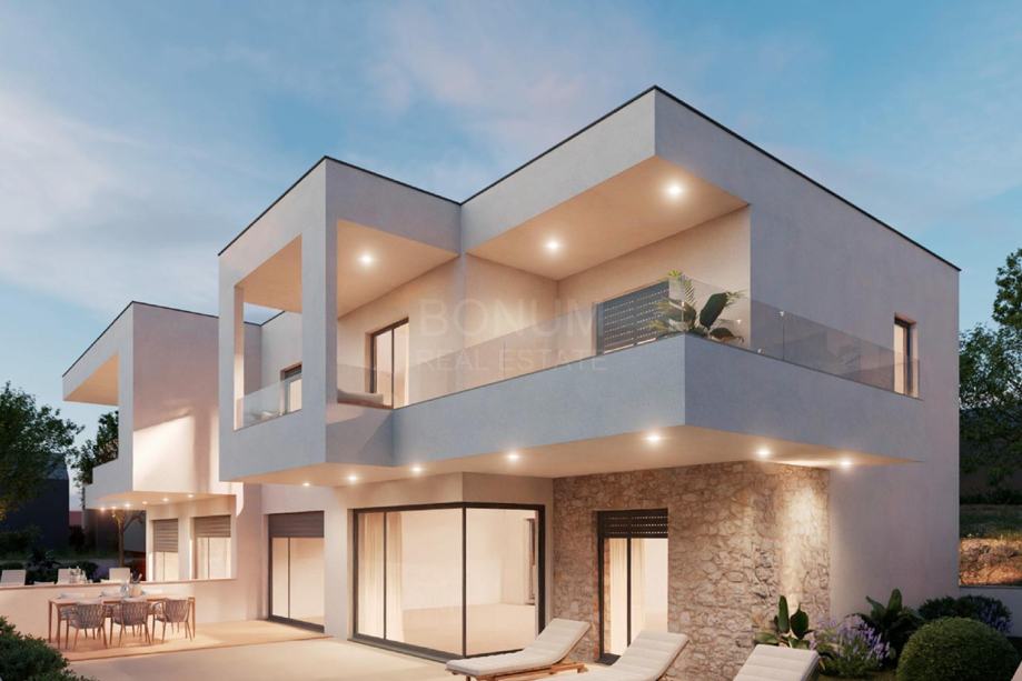 Prodaje se prekrasna luksuzna dvojna kuća s nevjerojatnim pogledom na more, smještena u mjestu Dolac, 2 km od Primoštena i samo 500 metara od mora. Kuća nudi savršenu kombinaciju luksuza, komfora i idealne lokacije. Prostire se na dvije etaže i ima ukupno 153,15 m² neto površine. U prizemlju se nalazi jedno parkirno mjesto, ulazni prostor, garderoba, ostava, kupaonica s WC-om, spavaća soba, blagovaonica i dnevni boravak otvorenog koncepta. Iz dnevnog boravka i spavaće sobe izlazi se na terasu s prekrasnim pogledom na more i grijanim bazenom, idealnim za uživanje u toplim ljetnim danima i tijekom cijele godine. Na prvom katu smještene su dvije kupaonice te tri spavaće sobe s izlazom na terasu i pogledom na more, pružajući privatnost i maksimalan komfor za opuštanje. Kuća uključuje video nadzor i alarmni sustav za maksimalnu sigurnost, solarne sustave za smanjenje troškova električne energije i ekološku prihvatljivost te najmodernije materijale i opremu za vrhunsku kvalitetu, udobnost i energetsku učinkovitost. Odlikuje se modernim linijama eksterijera i interijera, stvarajući savršen ambijent za potpunu relaksaciju i idealna je za obiteljski odmor.