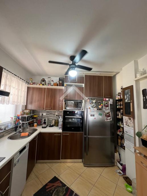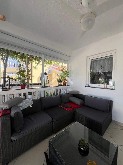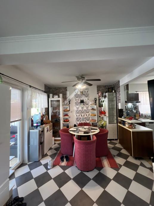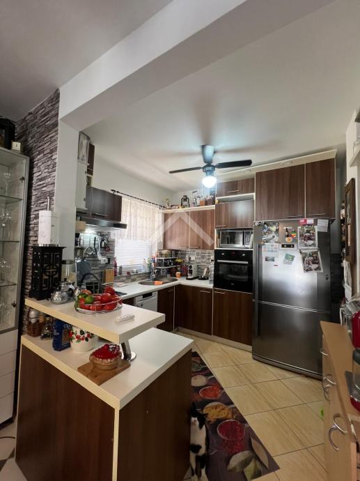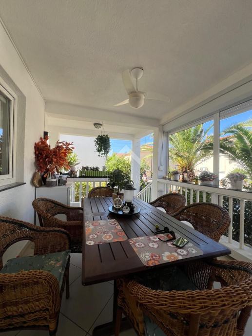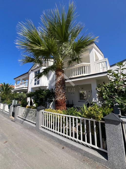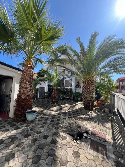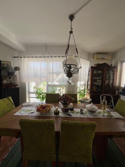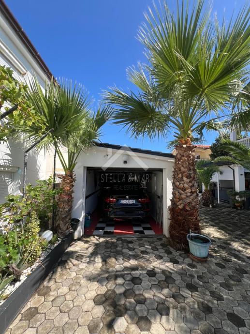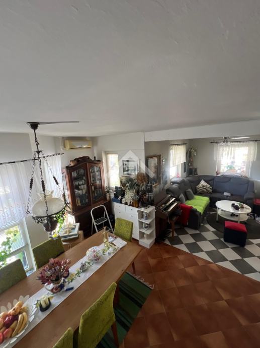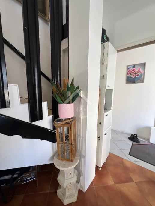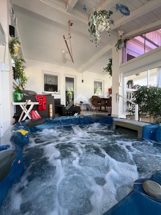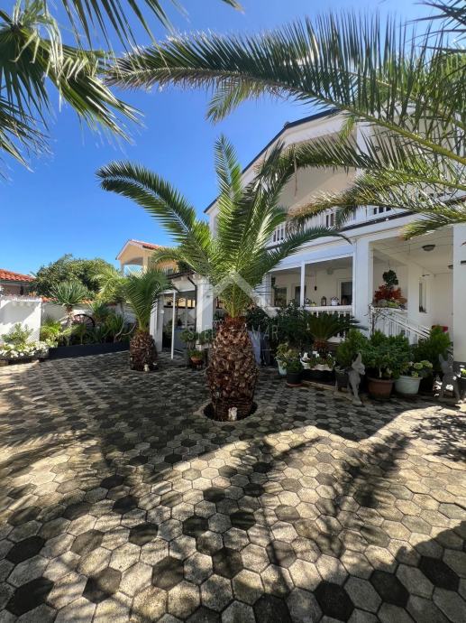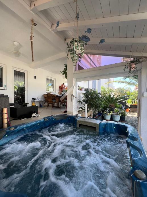 Kuća je vrlo prostrana, terase također. Stan u prizemlju sastoji se od kuhinje i blagovaone, dnevnog boravka, kupaonice, dvije spavaće sobe, hodnika i terase površine 18m2 + jacuzzi koji je natkriven u dnu terase sa zasebnim prostorom. Na katu stan koji se sastoji od kuhinje sa blagovaonom, dnevnog boravka, četiri spavaće sobe, dvije kupaonice, prostrana američka garderoba te dvije terase od kojih jedna ima pogled na more veličine 33m2, te manja površine 8m2. Objekt se prodaje djelomično namješten, a ostalo sve po dogovoru.