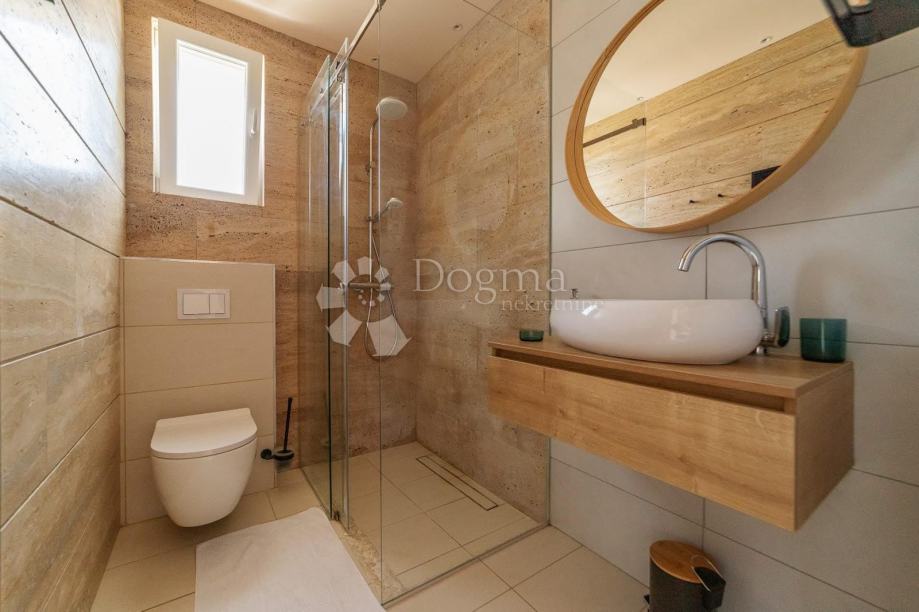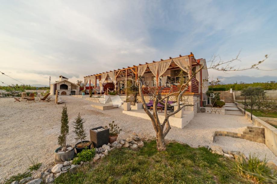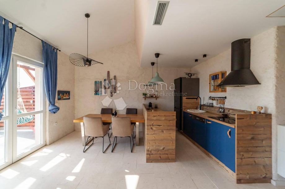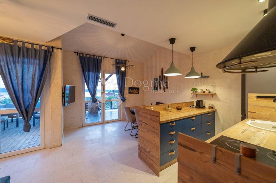Veličina kuće je 147 m2 i sastoji se od 3 dizajnerski uređena apartmana koji osvajaju na prvi pogled. Pogled koji se širi iz sva tri dnevna boravka , kuhinje i terase je okrenut prema moru.