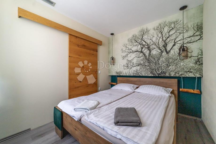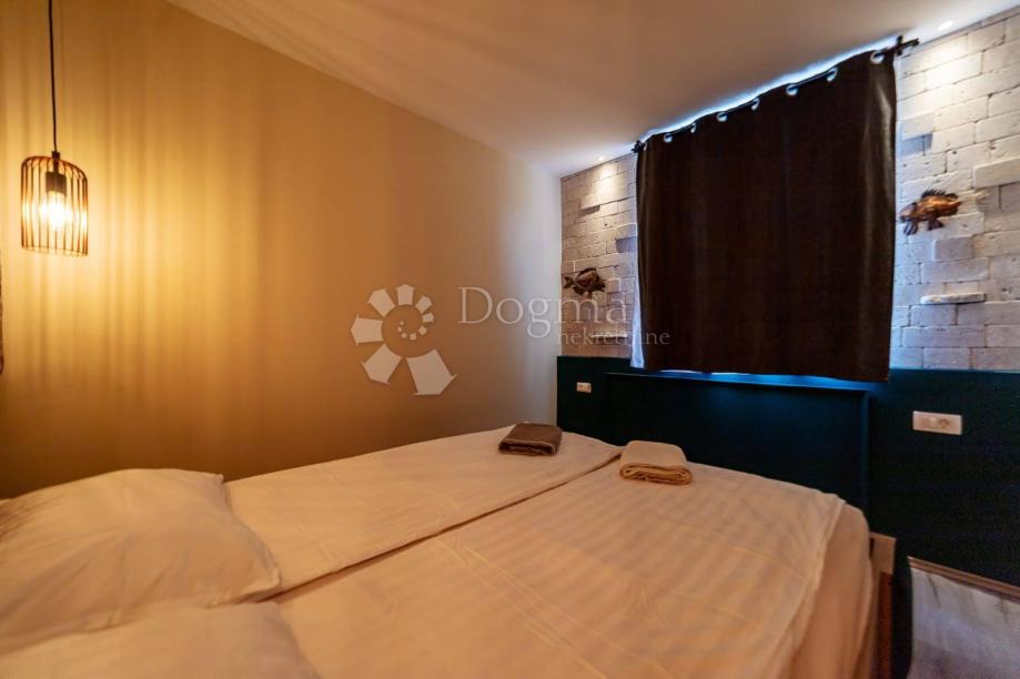 Prvi apartman ima dvije spavaće sobe, kupaonicu, dnevni boravak, kuhinju, blagovaonicu i prostranu terasu. Ovaj apartman pažljivo je dizajniran do najsitnijih detalja u temi kamena. Pod je popločan pravim kamenom kao i cijela kupaonica, a zidovi imaju rustikalan izgled s morskim detaljima. Rasvjeta je na senzore. Klima je centralna, što znači da se u zid ugrađuje kontroler na kojem se podešava temperatura i program, a sustav hladi svaku prostoriju pojedinačno prema vašim uputama.