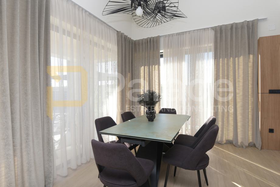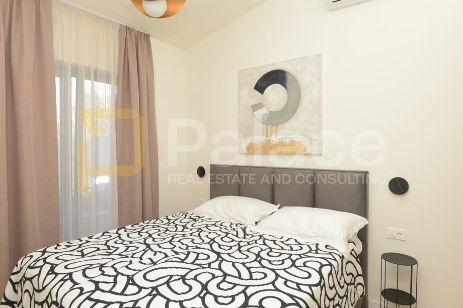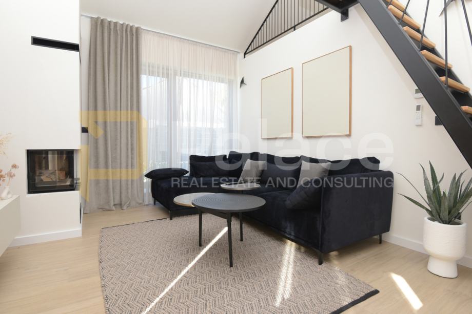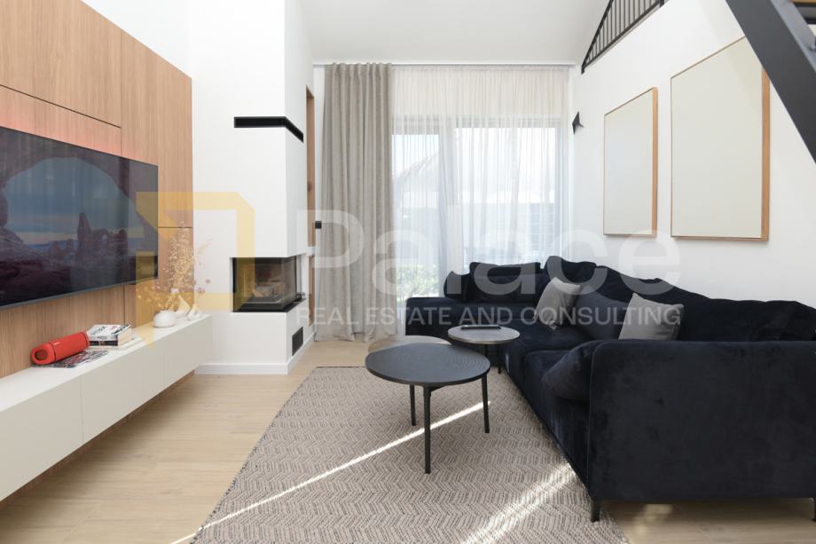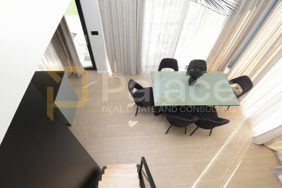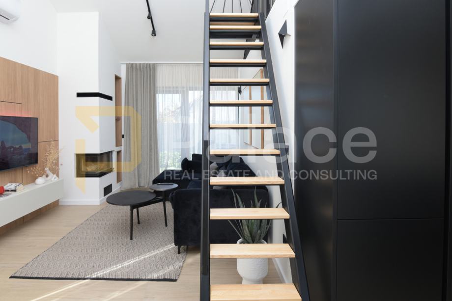 Površine 107,71 m2, ima ulazni hodnik, kupaonicu, praonicu, dvije spavaće sobe ( svaka sa svojom kupaonicom) te veliki dnevni boravak s blagovaonicom i kuhinjom iz kojih se pruža izlaz na dvorište i bazen površine 35,38 m2. U dnevnom boravku se nalaze i stepenice koje vode do galerije gdje je bračni krevet tako da u kući može spavati 6 osoba. Parcela ima površinu 1131 m2, i odlično je iskorištena na način da ima vanjsku kuhinju, roštilj, nekoliko zona za druženje i opuštanje, kao i tri parkirna mjesta sa stražnje strane kuće. Živica je posađena oko cijele nekretnine te ima ugrađen sustav za navodnjavanje.