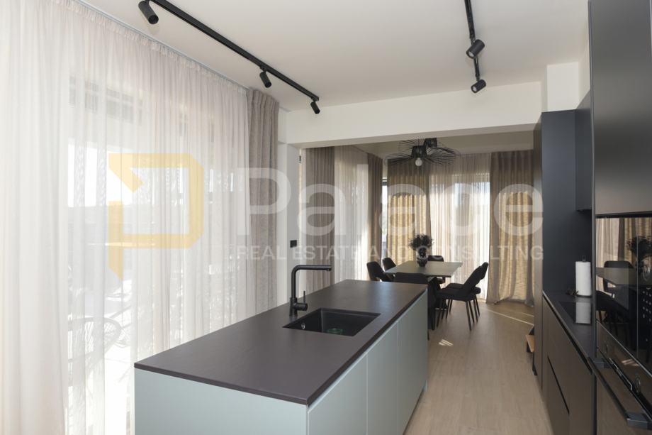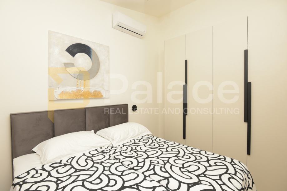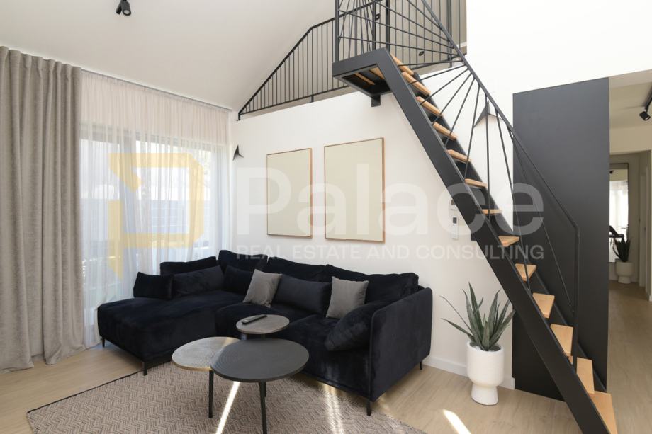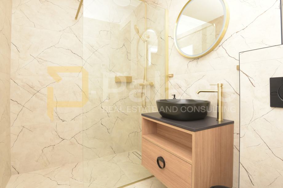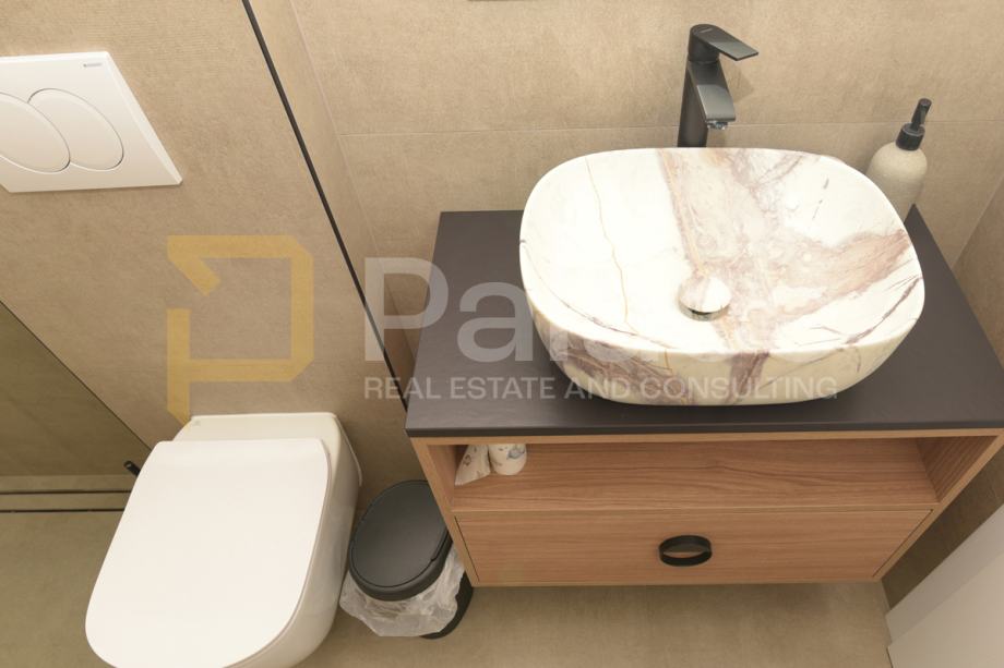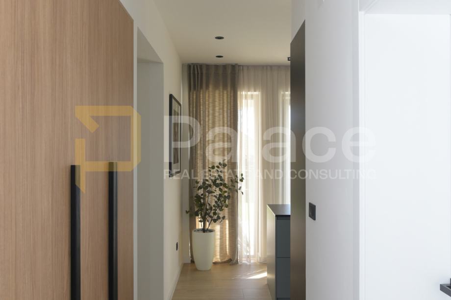 Površine 107,71 m2, ima ulazni hodnik, kupaonicu, praonicu, dvije spavaće sobe ( svaka sa svojom kupaonicom) te veliki dnevni boravak s blagovaonicom i kuhinjom iz kojih se pruža izlaz na dvorište i bazen površine 35,38 m2. U dnevnom boravku se nalaze i stepenice koje vode do galerije gdje je bračni krevet tako da u kući može spavati 6 osoba. Parcela ima površinu 1131 m2, i odlično je iskorištena na način da ima vanjsku kuhinju, roštilj, nekoliko zona za druženje i opuštanje, kao i tri parkirna mjesta sa stražnje strane kuće. Živica je posađena oko cijele nekretnine te ima ugrađen sustav za navodnjavanje.