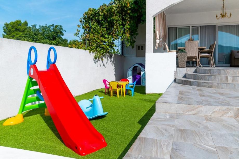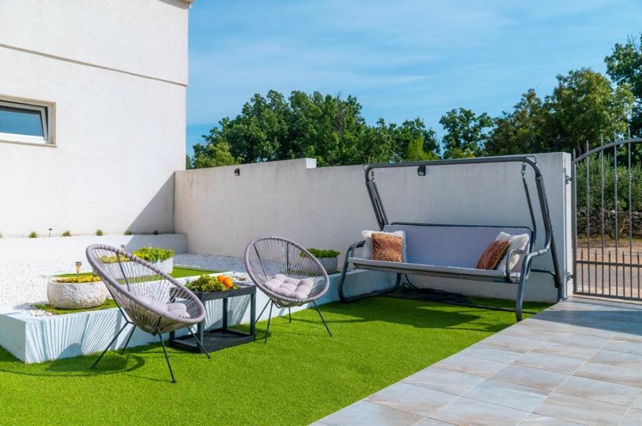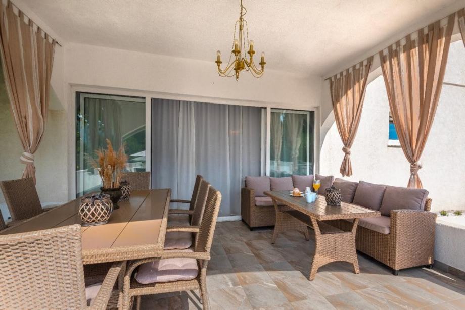 Iz dnevnog boravka pruža se izlaz na prostranu terasu koja gleda na predivan bazen, idealno mjesto za opuštanje i zabavu s obitelji i prijateljima.