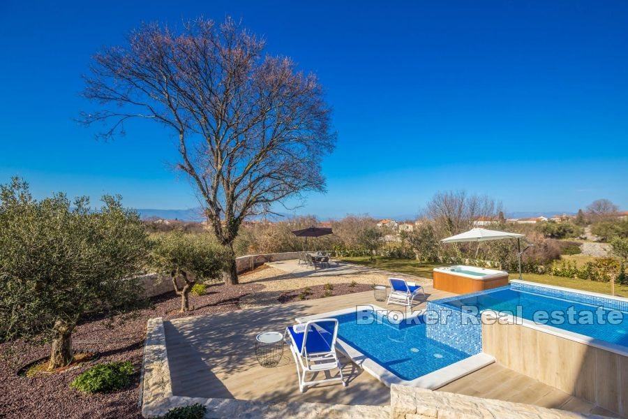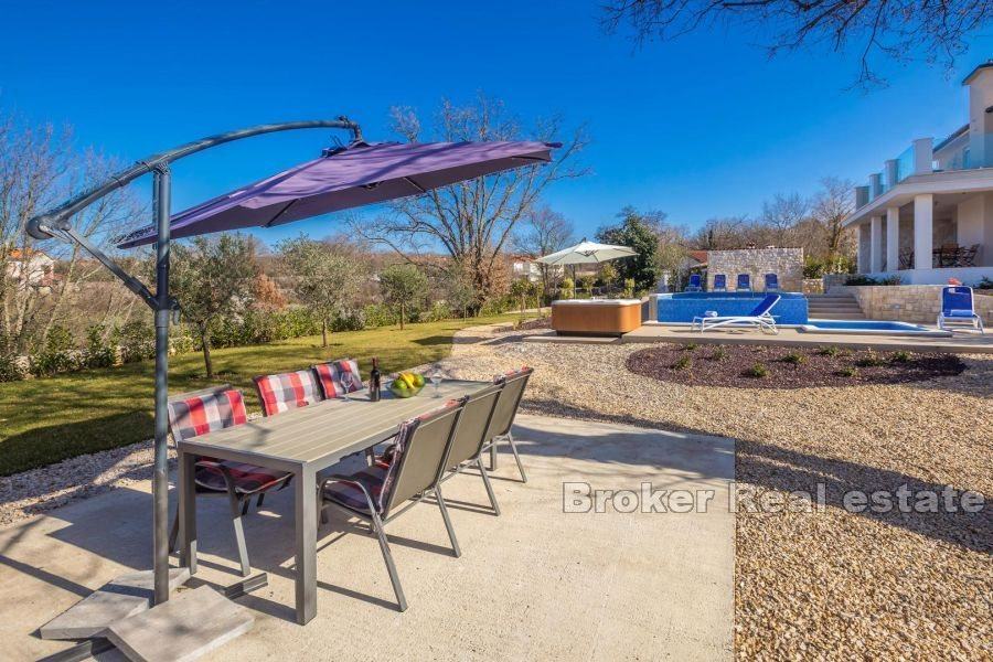 U lijepo uređenoj okućnici se nalazi grijani bazen sa sunčalištem, jacuzzi te prostor za opuštanje i druženje s bližnjima.