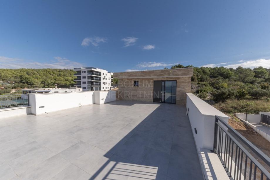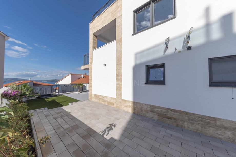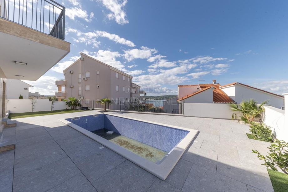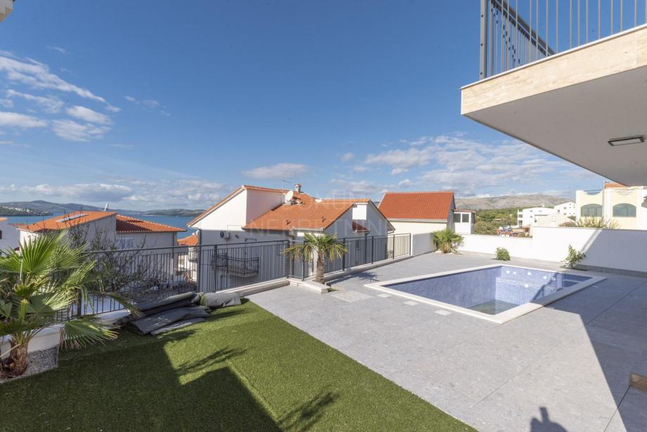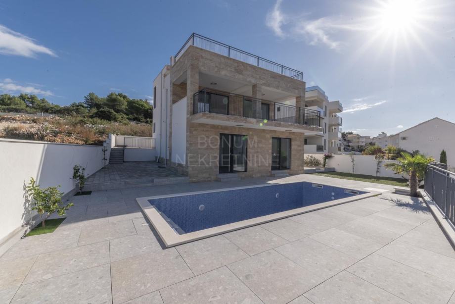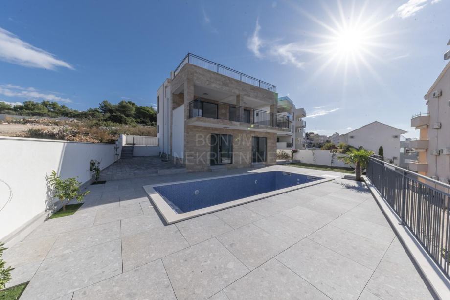 Prodaje se predivna samostojeća kuća s bazenom, Čiovo. Nalazi se na mirnoj lokaciji, te je u blizini mora te svih sadržaja. Sastoji se od prizemlja i prvog kata te krovne terase. U prizemlju je smještena garaža za jedan automobil te jedna kupaona, tri spavaće sobe( od kojih svaka ima svoju kupaonu). Ispred soba je izlaz na dvorište te bazen. Unutarnjim stubištem se ide na prvi kat gdje je smješten dnevni dio s kuhinjom i blagovaonom u jednoj cjelini, jedna spavaća soba s kupaonom, toalet te dijelom natkrivena terasa. Također, unutarnjim stubištem se ide na krovnu terasu koja je dijelom natkrivena te je u natkrivenom dijelu predviđena kuhinja s blagovaonom i još jedan toalet. Kuća je useljiva, kvalitetno je građena te opremljena. Ima odličan pogled na more te obližnji arhipelag. Do zračne luke ima svega 10-tak minuta automobilom. Odlična nekretnina bilo za stalan boravak bilo za turističku rentu.