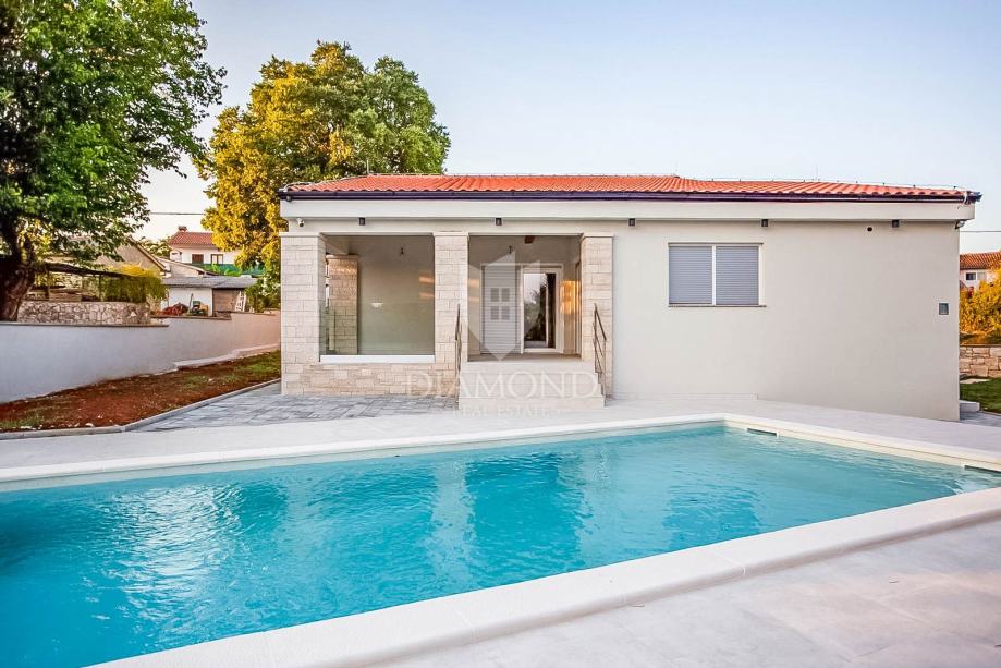 Ova prizemna montažna kuća smještena je na mirnoj lokaciji nekoliko kilometara od Rovinja, daleko od gradske vreve i prometa, okružena prirodom i bujnim zelenilom. Idealna za one koji traže spokoj i blizinu prirode, kuća je dizajnirana tako da pruža udobnost i prostor za cijelu obitelj.