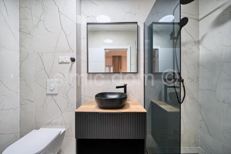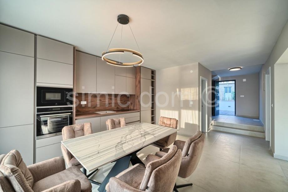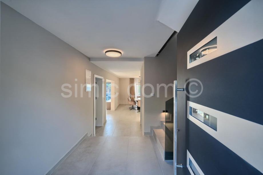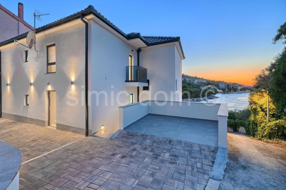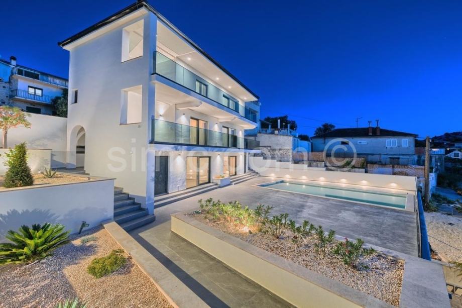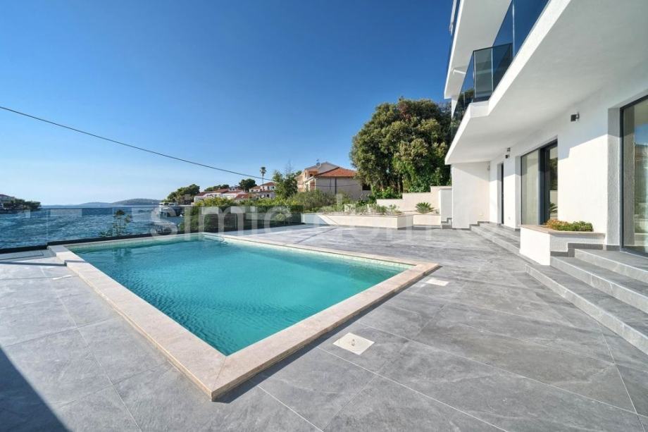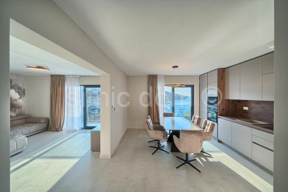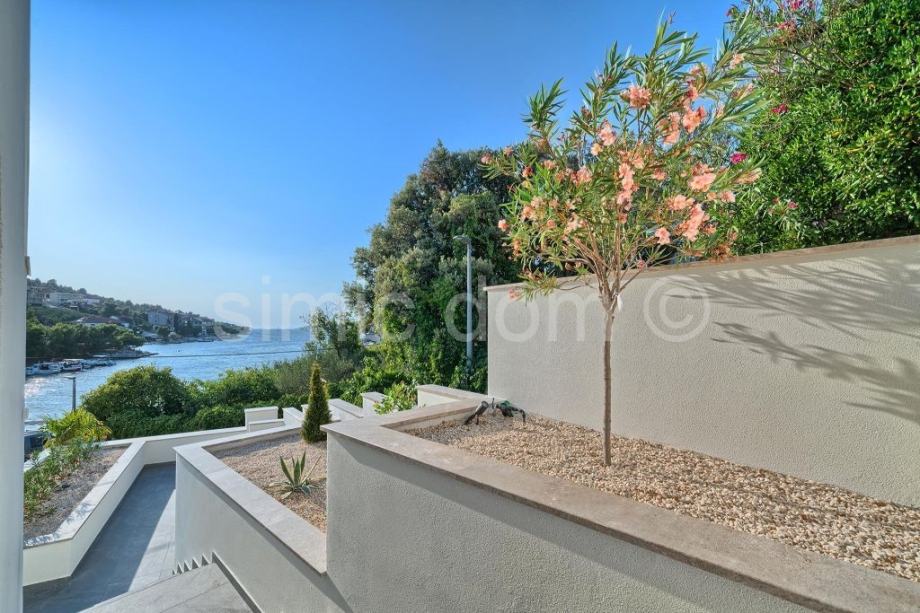 Posredujemo u prodaji nekretnine na atraktivnoj lokaciji, u prvom redu do mora, u mirnom mjestu blizu Rogoznice, a opet u blizini svih važnih sadržaja – dućana, restorana i kafića. Kuća se nalazi na lagano povišenom terenu što pruža bolju privatnost i predivan pogled na more sa svih etažakuće. U sklopu okućnice nalazi se veliki bazen, sunčalište te parking za tri automobila. Sama kuća ima ukupnu podnu površinu od 260m2, od čega je 195m2 unutarnje podne površine i sastoji se od tri etaže: prizemlja, prvog i drugog kata. U prizemlju nalazi se zasebna jedinica, apartman sa jednom spavaćom sobom, kupaonicom, kuhinjom otvorenog koncepta sa blagovaonicom i dnevnom boravkom iz kojeg se proteže lijep pogled na more budući da se kuća nalazi na lagano povišenom predjelu. Na etaži prizemlja nalaze se i dva spremišta. Prizemlje je odličan dodatak koji se može koristiti za najam ili kao dio kuće za goste. Prvi i drugi kat sastoje se od jedne cjeline. Na prvom katu nalaze se dvije kupaonice od kojih je jedna spojena sa spavaćom sobom, kuhinja sa blagovaonicom, te dnevni boravak. Unutarnje stepenice vode na drugi kat koji se sastoji od tri spavaće sobe, svaka s vlastitom kupaonicom i garderobom. Tu je također i balkon duž cijele kuće kako bi se uživalo u pogledu na more iz što više prostorija kuće. Nekretnina je trenutno u fazi renovacije, završetak se očekuje na proljeće 2025., a po završetku će biti potpuno namještena, klimatizirana i opremljena podnim grijanjem, pružajući luksuz i udobnost. Ovo je savršen izbor za sve koji traže mirnu i prestižnu lokaciju uz more, u blizini svih potrebnih sadržaja. Vlasništvo uredno.