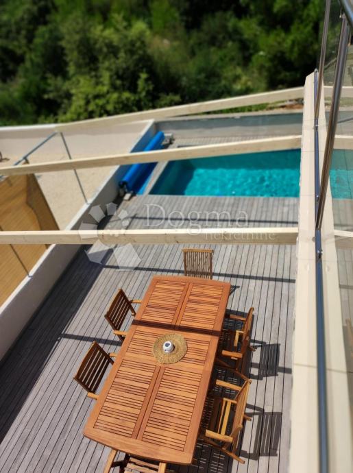 - na katu se nalaze 3 spavaće sobe sa kupaonicom, 2 terase od kojih je jedna sa panoramskim pogledom na more, bazen i dvorište, a druga na šumicu