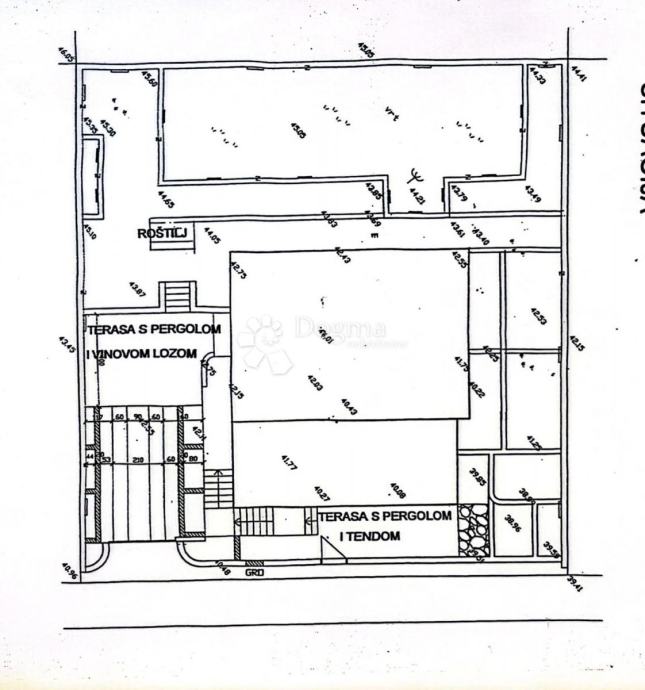 Uređena okućnica sa roštiljem, dvjema terasama sa pergolama, cvijećem, agrumima i začinskim biljem.