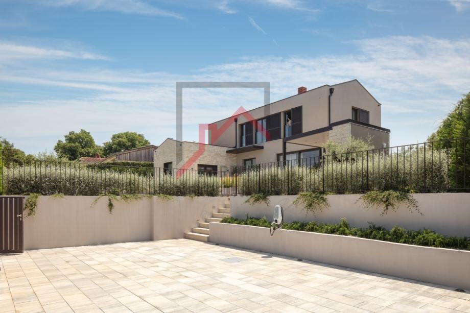 Naravno, naglasak moramo staviti na impozantnu metalnu kapiju koja uokviruje cijelu sliku unutar zidinama ograđenu nekretninu. Parking za dva vozila sa punjačem struje za električna vozila.