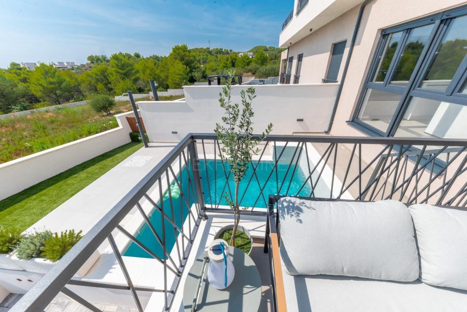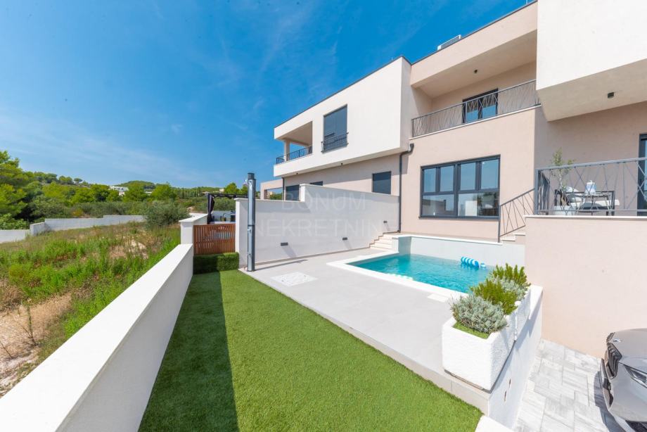 Prodaje se vrhunska moderna kuća s privatnim bazenom i panoramskim pogledom na more, smještena na idealnoj lokaciji u Vodicama, samo nekoliko minuta hoda od plaže i centra grada.