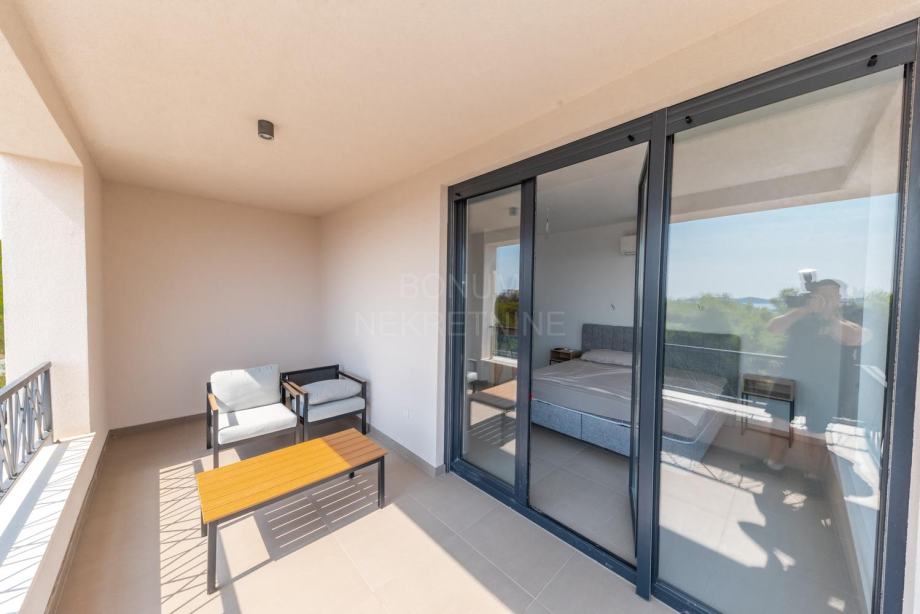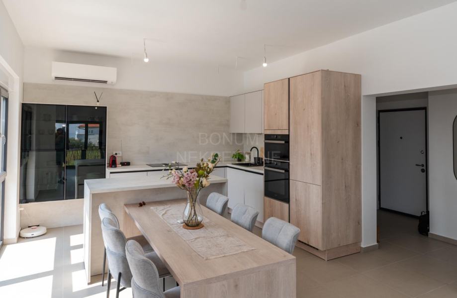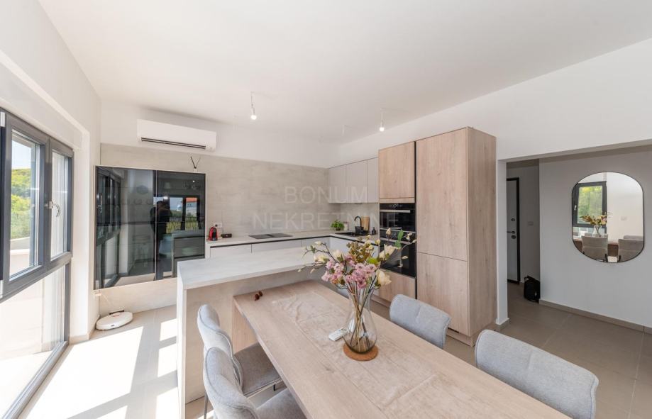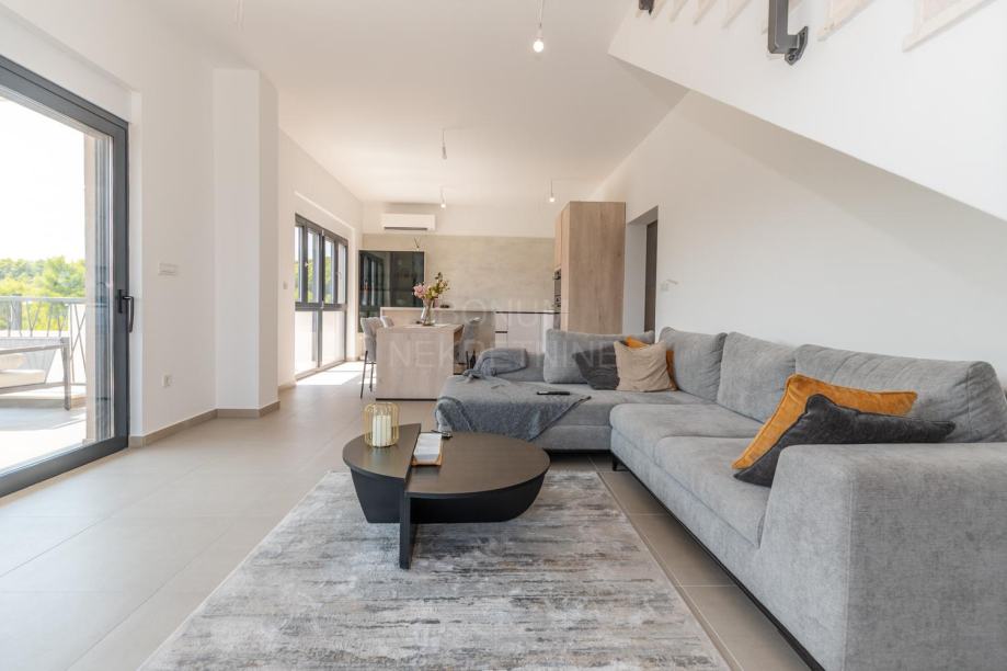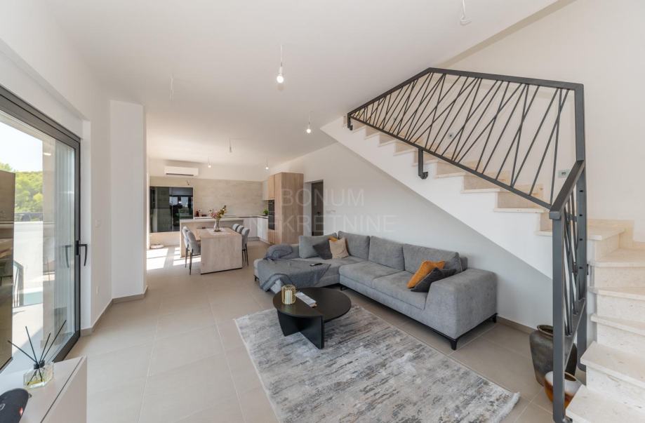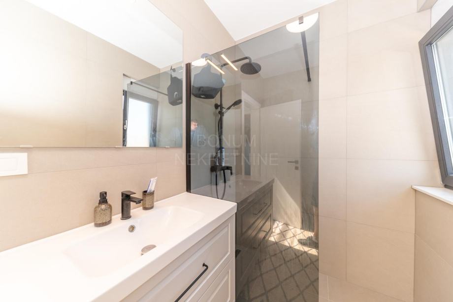 Kuća je opremljena visokokvalitetnom ALU stolarijom s komarnicima i roletama, keramičkim podovima vrhunske kvalitete, dizalicom topline i klima uređajima u svakoj prostoriji. Staklene ograde na terasama doprinose modernom izgledu, dok pažljivo uređeni vrt osigurava ugodnu atmosferu za boravak na otvorenom.
