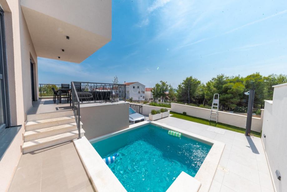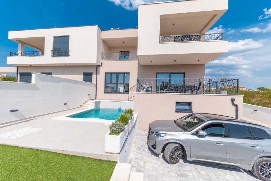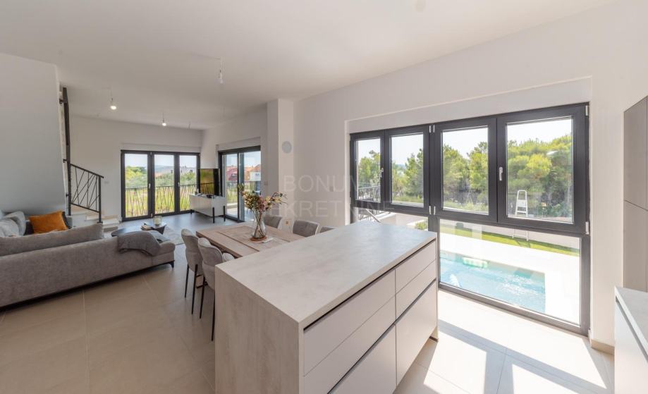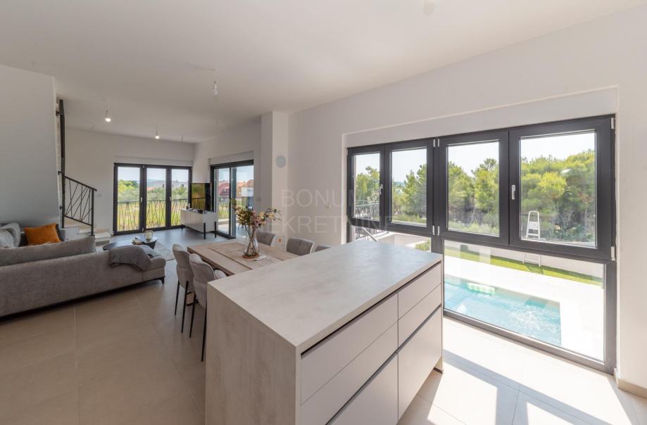 Prodaje se vrhunska moderna kuća s privatnim bazenom i panoramskim pogledom na more, smještena na idealnoj lokaciji u Vodicama, samo nekoliko minuta hoda od plaže i centra grada.