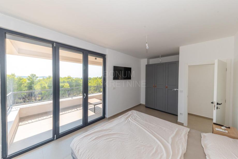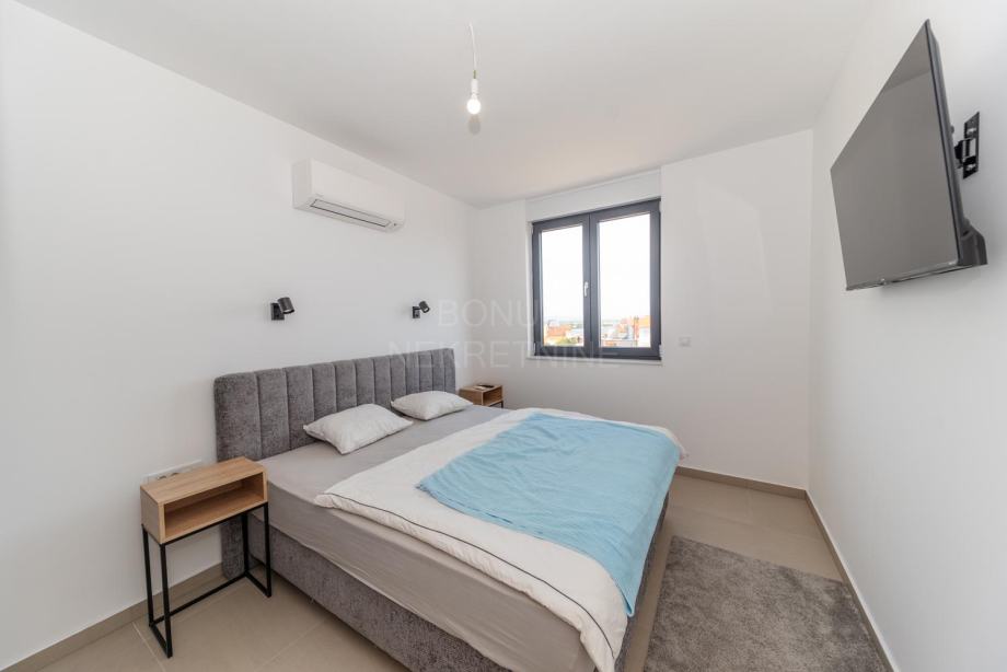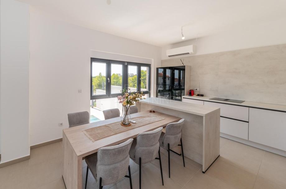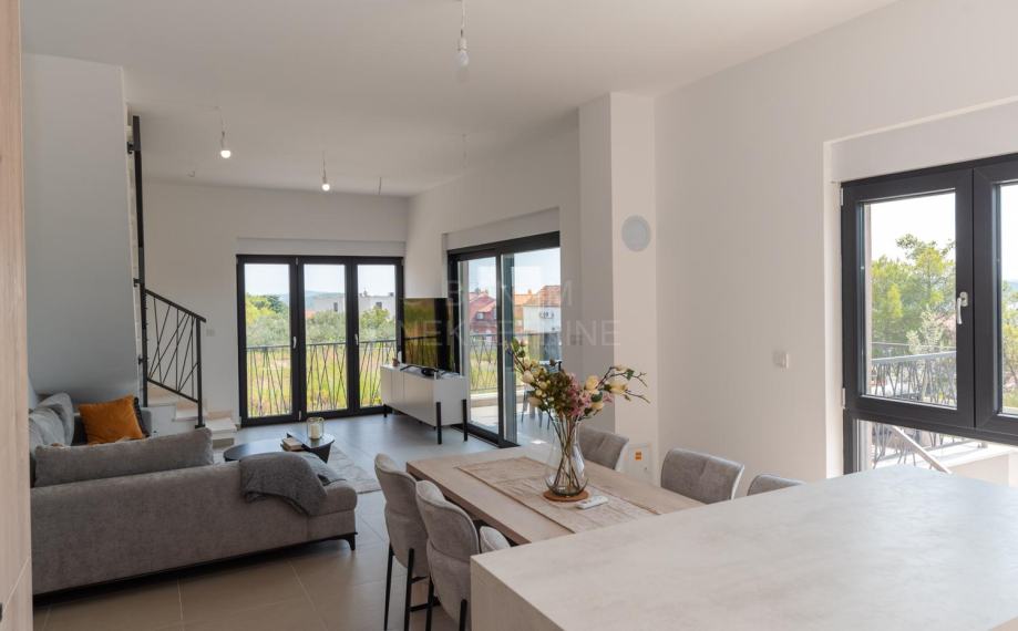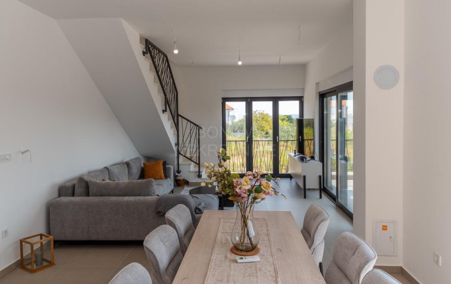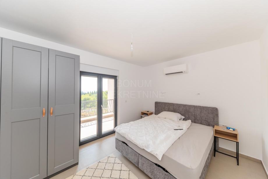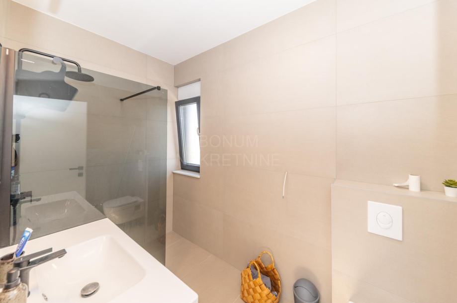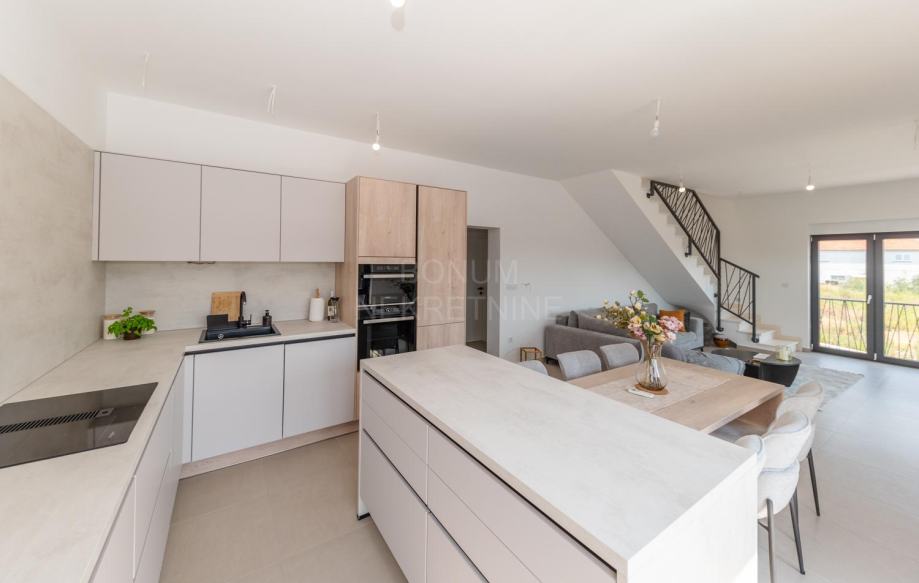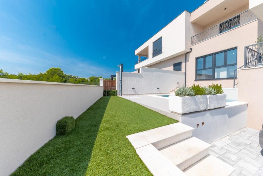 Kuća je opremljena visokokvalitetnom ALU stolarijom s komarnicima i roletama, keramičkim podovima vrhunske kvalitete, dizalicom topline i klima uređajima u svakoj prostoriji. Staklene ograde na terasama doprinose modernom izgledu, dok pažljivo uređeni vrt osigurava ugodnu atmosferu za boravak na otvorenom.