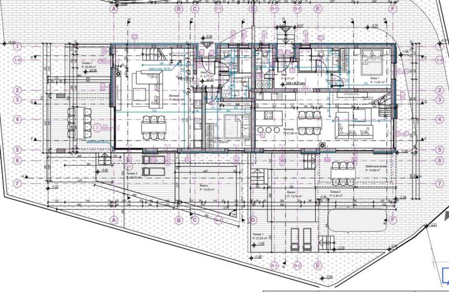 Prizemlje kuće ima zaseban ulaz s protuprovalnim vratima, a unutar njega nalazi se prostrani open space dnevni boravak s blagovaonicom, koji pruža prekrasan pogled na more. Na ovoj etaži nalazi se i moderna kuhinja, toalet, kupaonica te jedna spavaća soba. Dnevni boravak i blagovaonica imaju direktan izlaz na dvije terase s pogledom na jug i bazen površine 13,78 m².