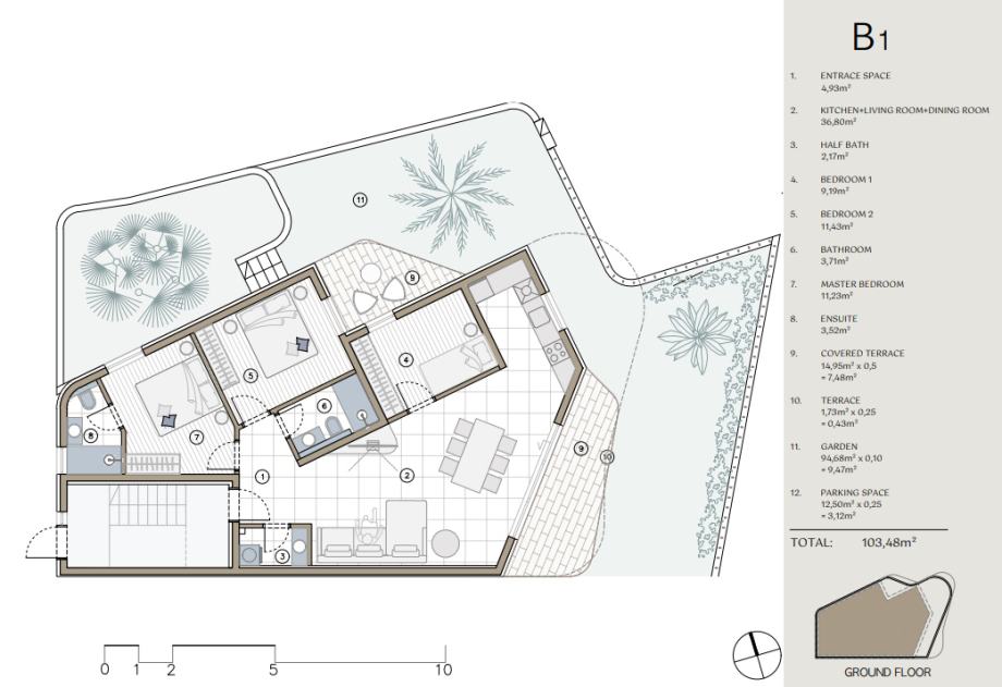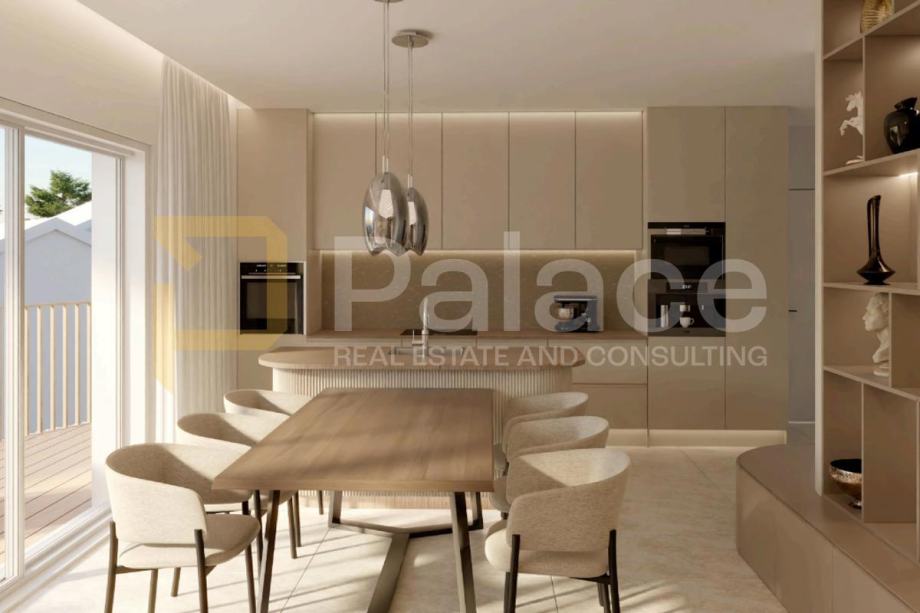 Ovaj šarmantan stan (B1), veličine 103,48 m2, smješten je u prizemlju druge zgrade koja ima ukupno tri stana, svaki na svojoj etaži. Pažljivim projektiranjem, osmišljen je maksimalno iskorišten prostor koji svojim novim vlasnicima nudi sve potrebno za provođenje najljepših ljetnih trenutaka. Open space koncept objedinjene kuhinje s blagovaonicom i dnevnim boravkom, daje dodatnu prostornost cijelom stanu. Južna orijentacija i velika staklena stijena osiguravaju mnogo prirodnog svijetla, što cijeli prostor čini prozračnim i ugodnim za boravljenje. Iz dnevnog boravka i spavaćih soba se pruža izlaz na terasu površine 16,68 m2 koja okružuje stan kao i vrt površine 94,68 m2. Sastoji se od tri spavaće sobe od čega master soba ima vlastitu kupaonicu, kupaonice, hodnika i wc-a, a pripada mu i vanjsko parkirno mjesto. Predviđeni završetak je kraj 2026. godine.