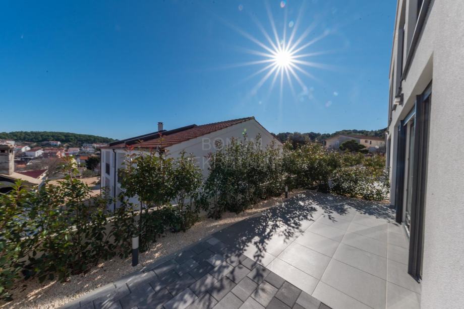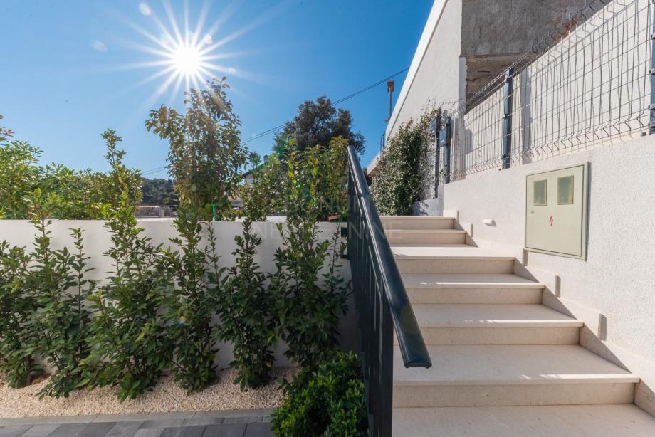 Kuća je u potpunosti dovršena i odmah useljiva. Opremljena je protuprovalnim vratima, aluminijskom stolarijom s električnim roletama, podnim grijanjem u kupaonicama te klima uređajem u svakoj prostoriji. Okoliš je uređen mediteranskim biljem, a parkirni prostor je popločan. Udaljenost do mora iznosi 300 metara, dok je centar mjesta na 1000 metara.