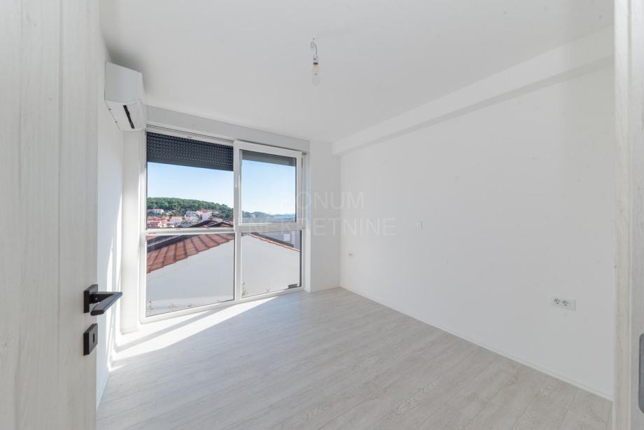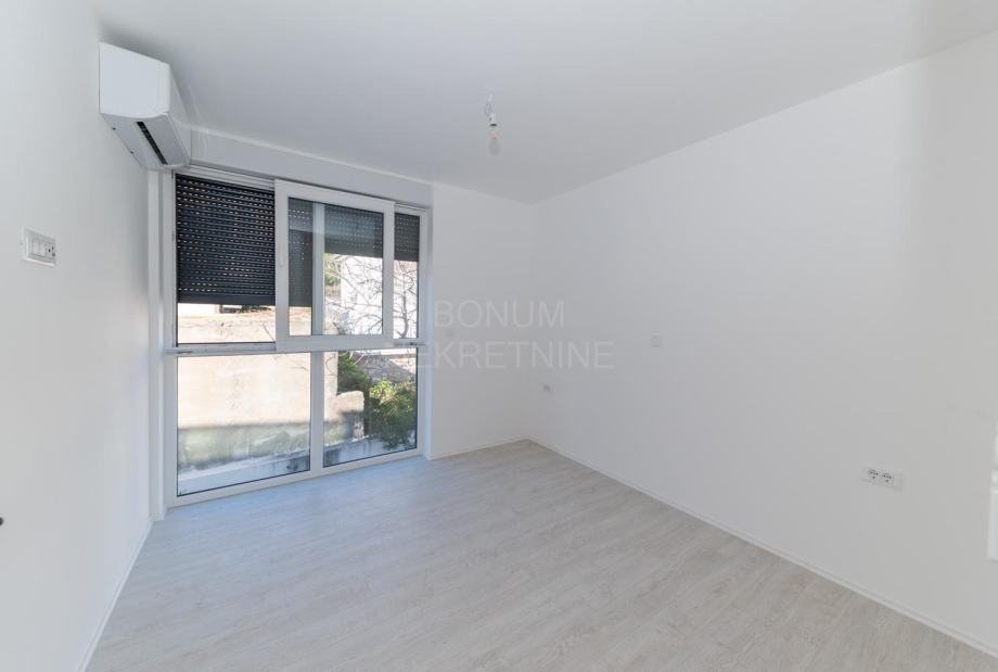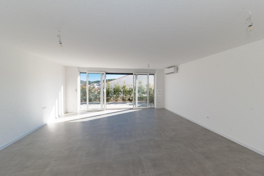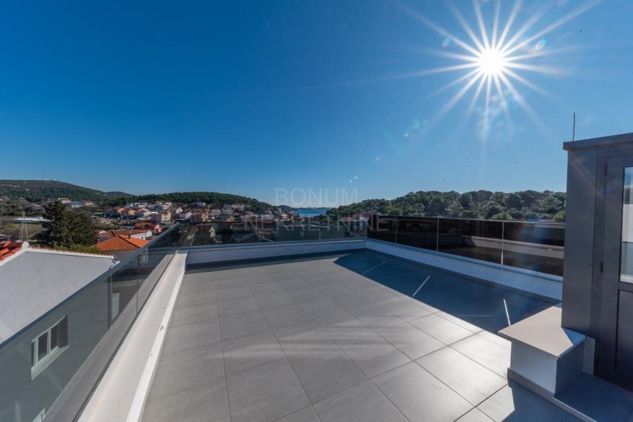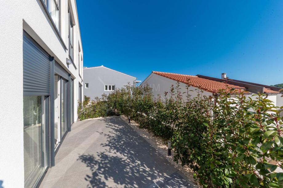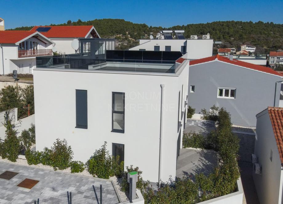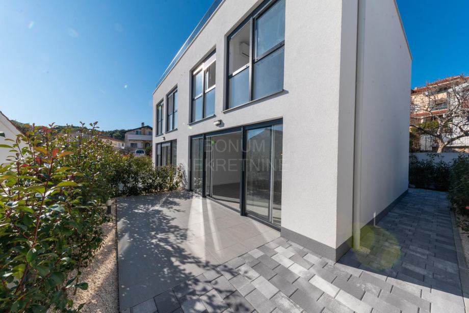 Prizemlje se sastoji od hodnika, kupaonice, spremišta te prostranog dnevnog boravka s kuhinjom i blagovaonicom, koji imaju izlaz na terasu i pripadajuće dvorište. Na prvom katu smještene su tri spavaće sobe, kupaonica i hodnik, dok se na drugom katu nalazi velika krovna terasa površine 24,50 m² s koje se pruža lijepi pogled na more.