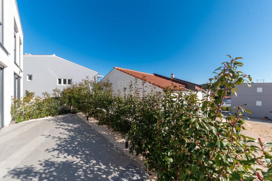 Kuća je u potpunosti dovršena i odmah useljiva. Opremljena je protuprovalnim vratima, aluminijskom stolarijom s električnim roletama, podnim grijanjem u kupaonicama te klima uređajem u svakoj prostoriji. Okoliš je uređen mediteranskim biljem, a parkirni prostor je popločan. Udaljenost do mora iznosi 300 metara, dok je centar mjesta na 1000 metara.