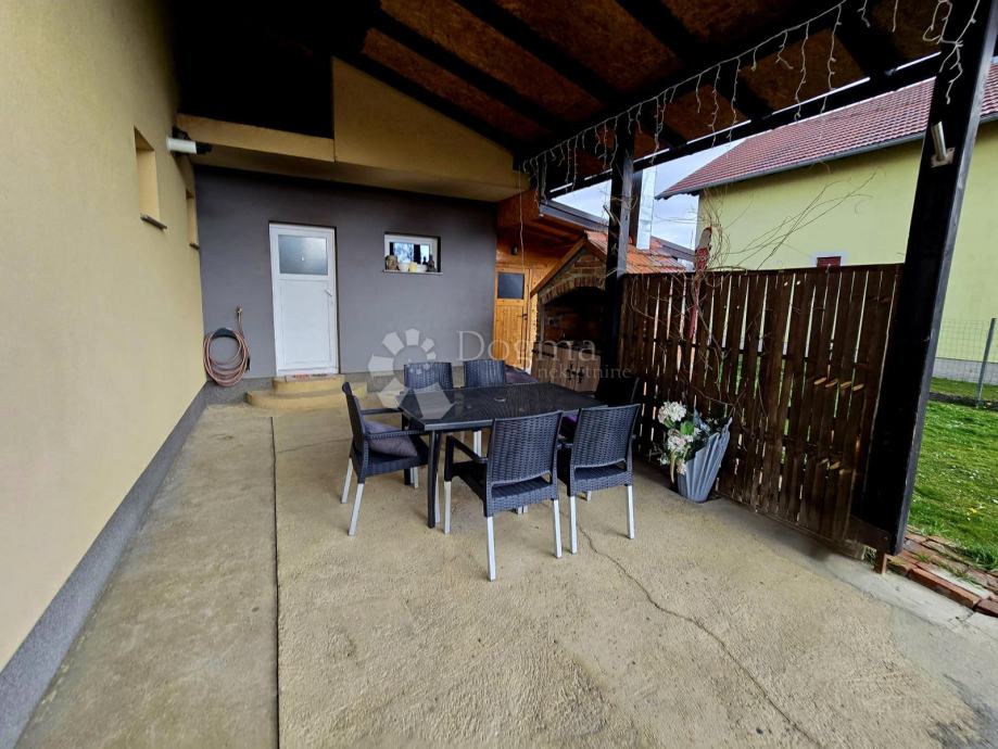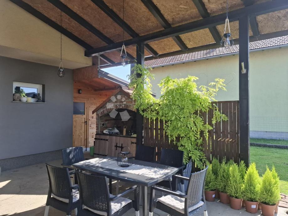 Okućnica je lijepo uređena i održavana te nudi natkrivenu terasu s zidanim roštiljem, savršenu za druženja. Posebna soba za odmor s vlastitim ulazom dodatni je plus, dok se u vrtu nalazi i vrtna kućica za alat. Prodaje se namještena.