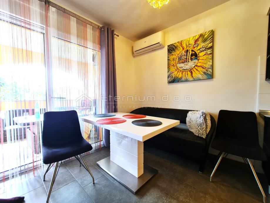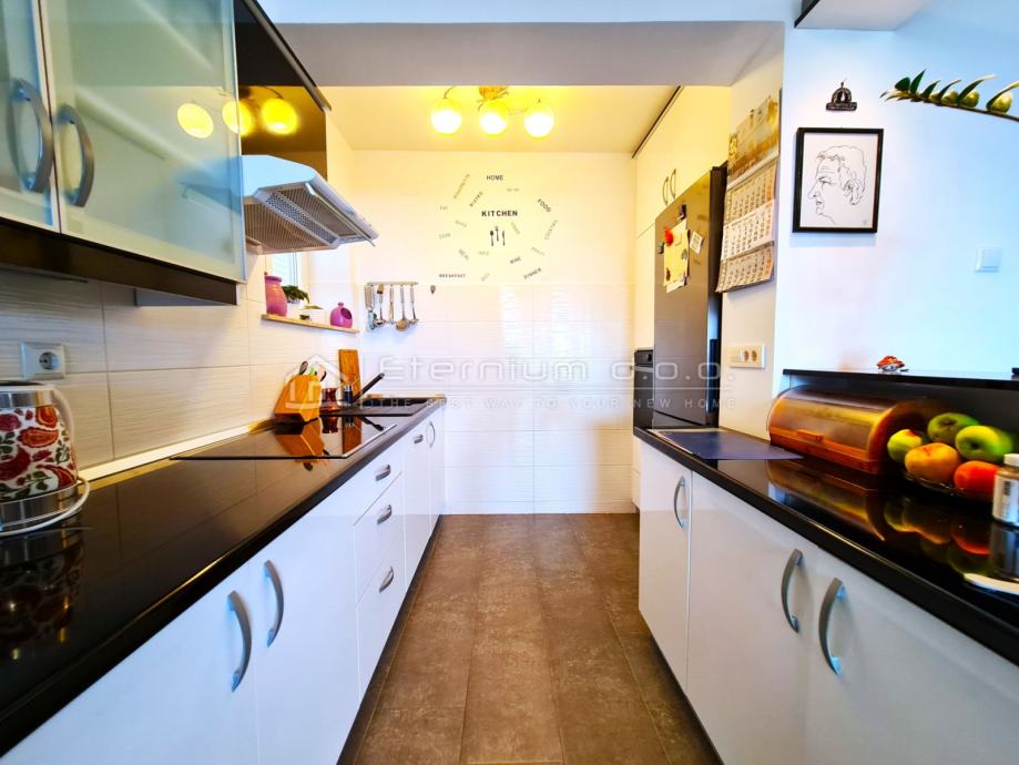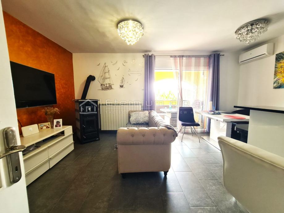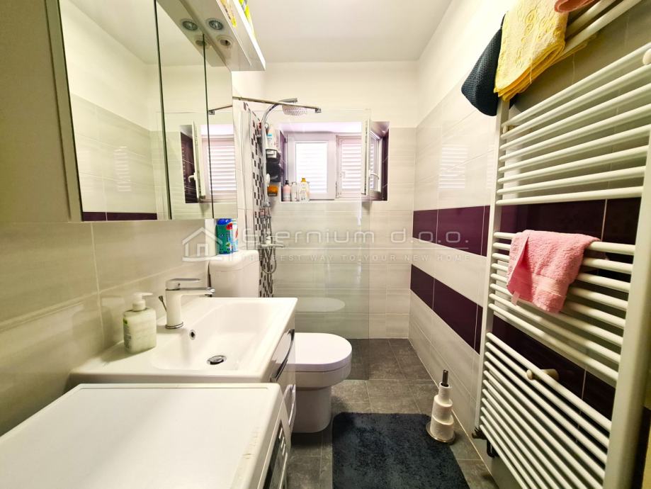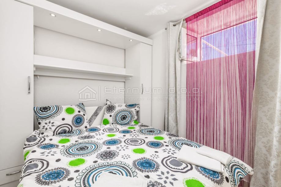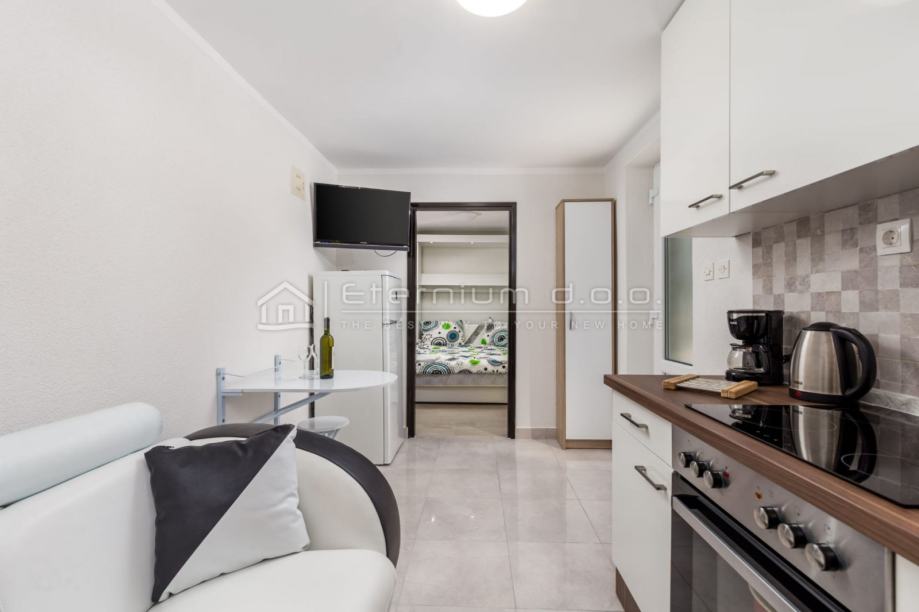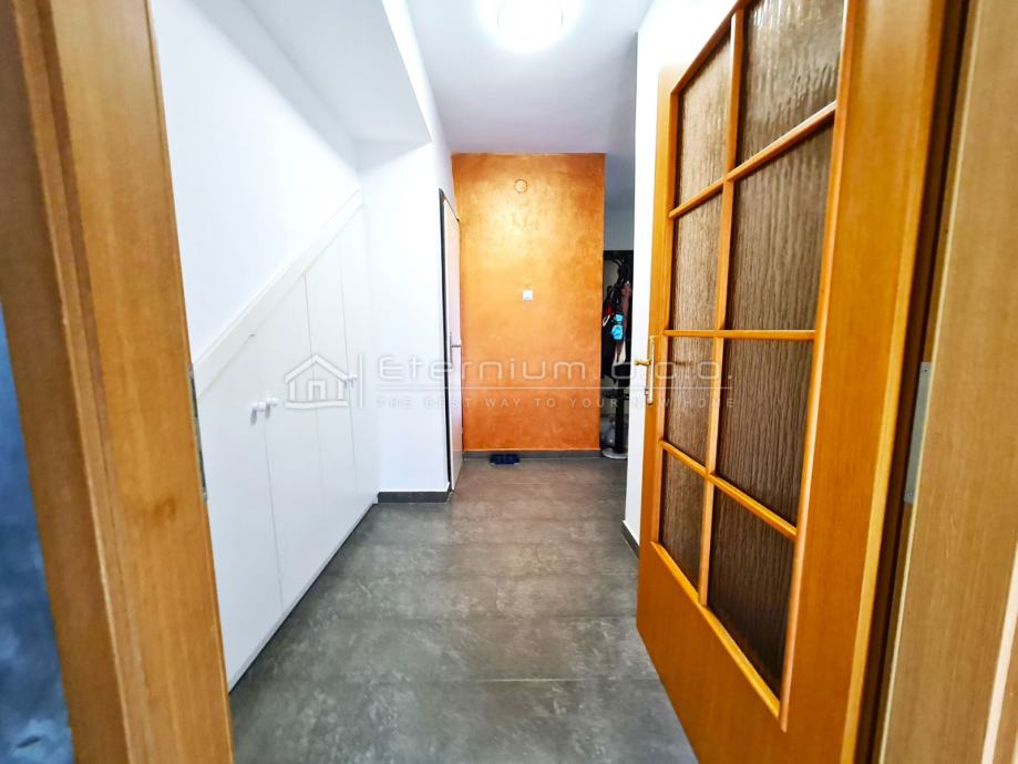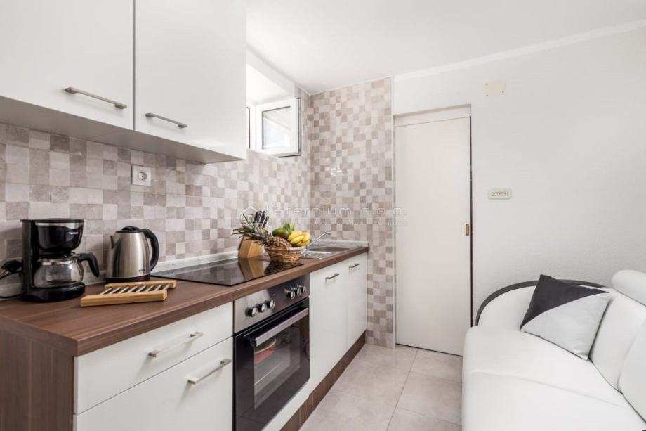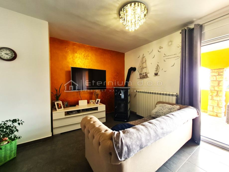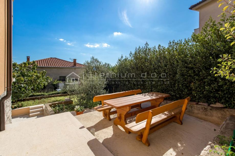 Prizemlje se sastoji od predulaza i stepenica za na kat, ulaznoga hodnika, gostinjskoga wc-a, krasne moderne kupaone, dvije spavaće sobe te dnevnoga dijela kojega čine dnevni boravak, kuhinja i blagovaona. Glavna spavaća soba je površine cca 20m2 te ima izlaz na natrkivenu terasu kao i dnevni dio, a sa terase se pruža djelomičan pogled na more. Kat je tlocrtno jednak prizemlju, s time da nema gostinjski wc jer tu dolaze stepenice, ali je pogled sa ove etaže predivan, otvoren, panoramski.