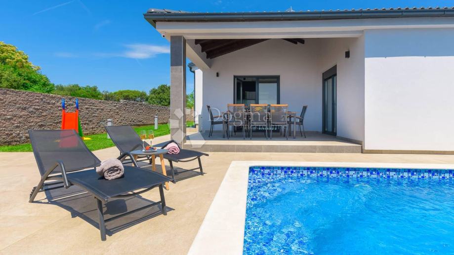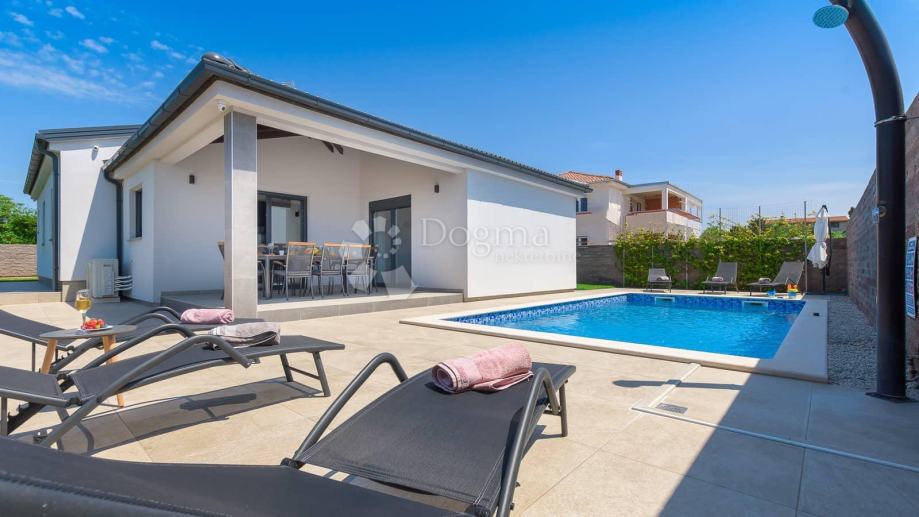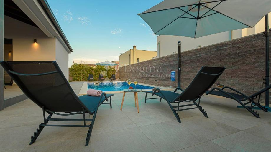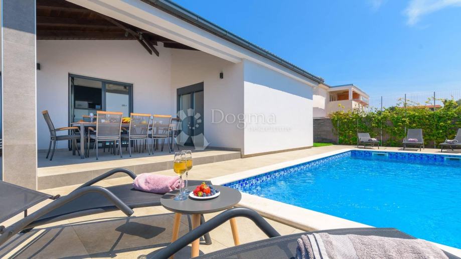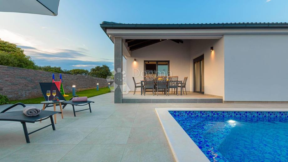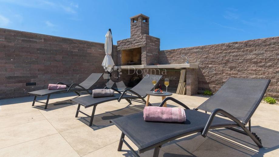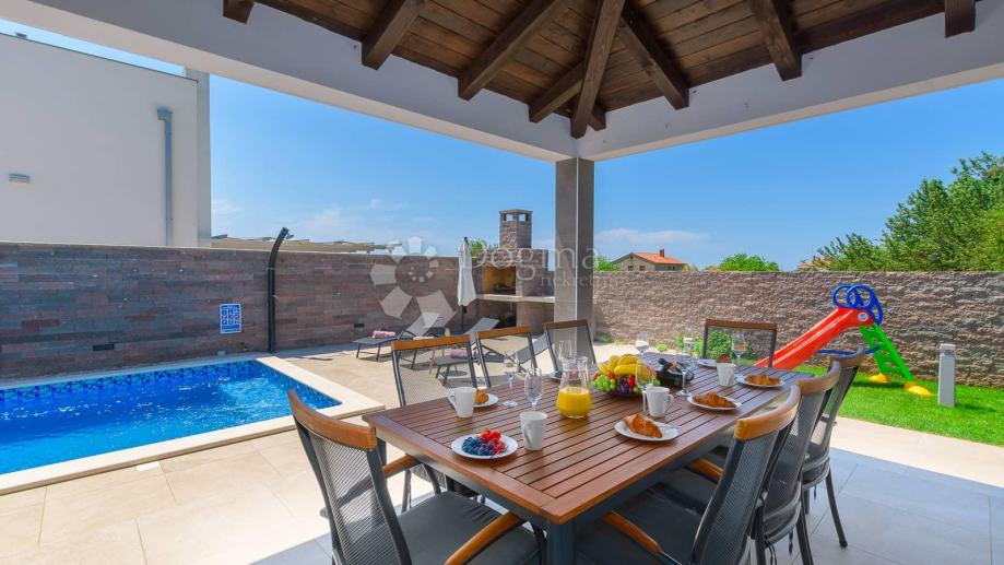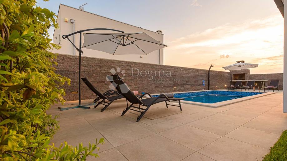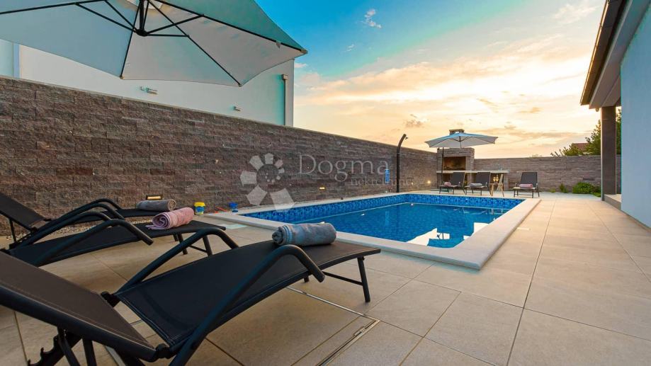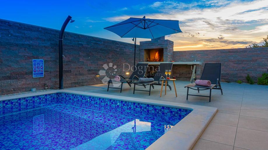 Sa druge strane okućnice proteže se bazen koji za očuvanje kvalitete vode koristi slanu vodu i elektrolizu te samim time nema dodavanja nikakvih kemikalija. Bazen u svom sastavu ima i jacuzzi za dodatnu razonodu i opuštanje. Uz bazen 8 ležaljki i 2 velika suncobrana dižu ljetno uživanje na viši nivo. Neposredno uz bazen roštilj i ljetna kuhinja daju mogućnost kuhanja i roštiljanja na otvorenom a natkrivena terasa prostor za druženja na otvorenom.