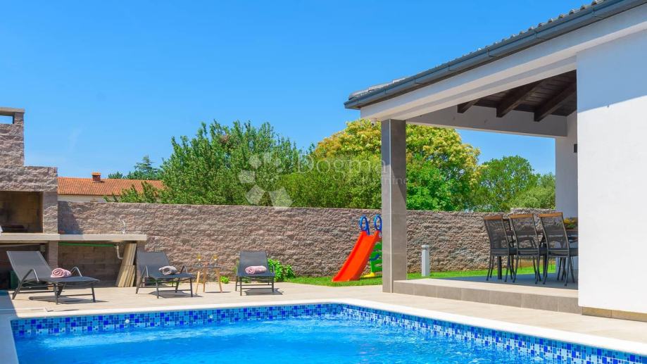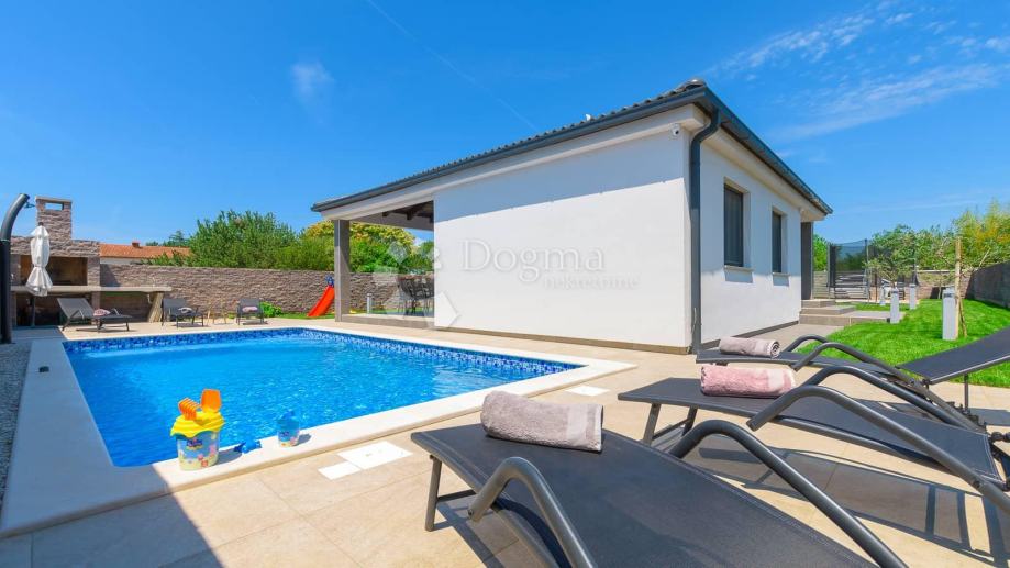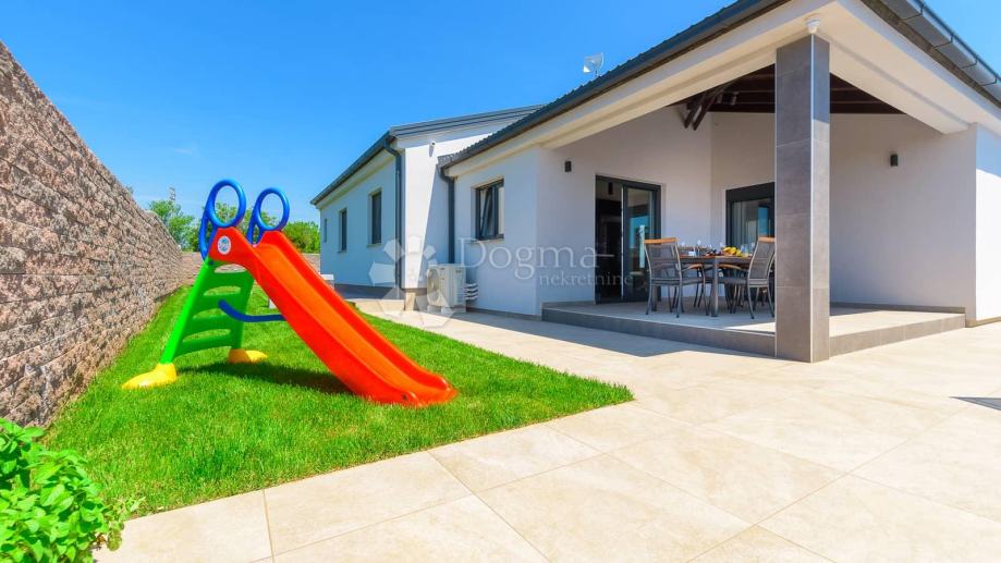 Kuća je izgrađena na okućnici od 559 m2 u prednjem dijelu okućnice u koji se ulazi kroz električni portun koji daje dodatnu komociju ulazi se na parking za 4-5 automobila. sa svake strane parkinga imamo zelenu površinu sa kvalitetnom američkom travom kojoj je potrebno manje vode i lakša je za održavanje navodnavanje za travu je automatsko, 3 masline stare 12 godina ovoj modernoj kući daju autohtoni istarski štih. Okućnica pruža i bezbrižnu zabavu za djecu uz tobogane i trampolin.