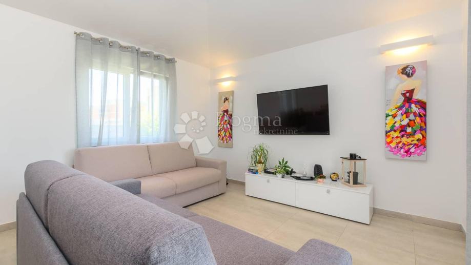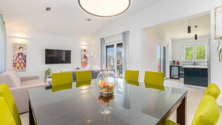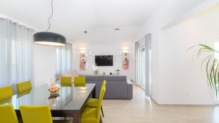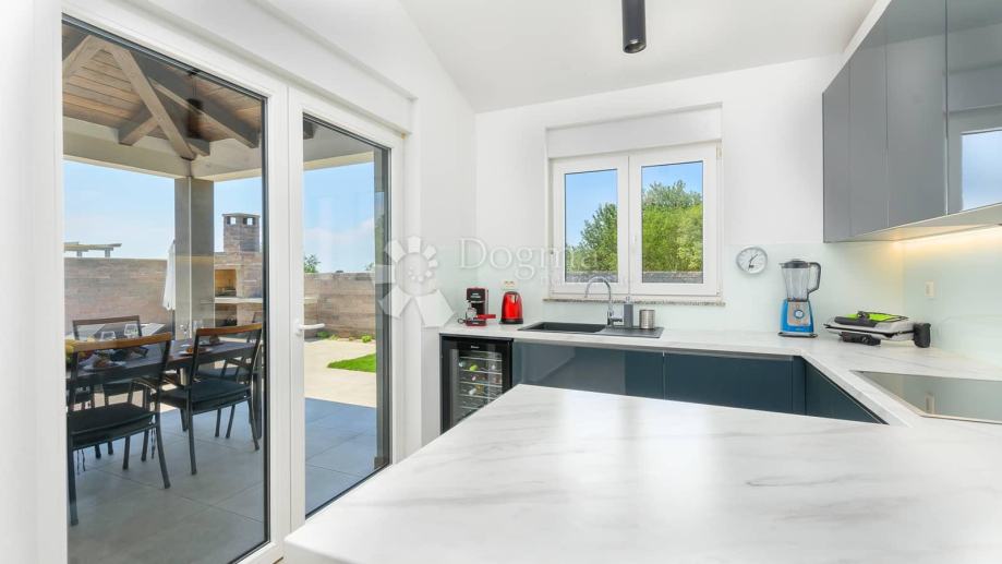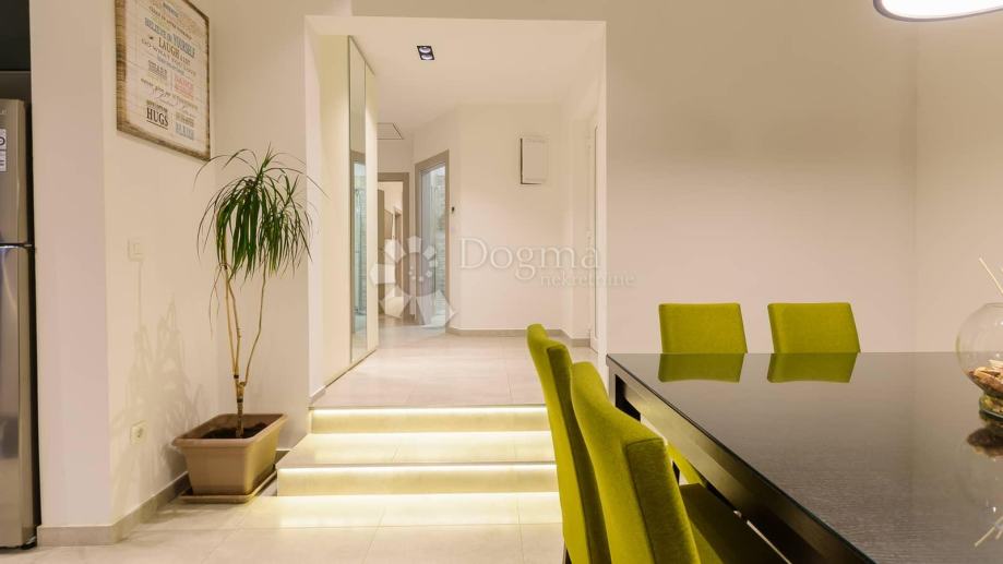 Kuća ima sljedeći raspored predsoblje iz kojeg se spušta open space dnevni boravak i blagovaonicu te kvalitetnu kuhinju opremljenu bosch-ovim aparatima. Hodnikom dolazimo do 3 spavaće sobe i 3 kupatila sva opremljena podnim grijanjem. Sav namještaj je kvalitetne izrade i rađen je po mjeri. Kvalitetna pvc stolarija sa električnim roletama na vratima, cijeloj kući pomaže u očuvanju energije te u isto vrijeme pruža dnevne svijetlosti napretek.