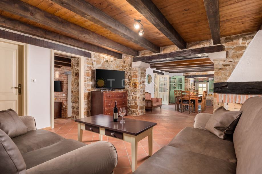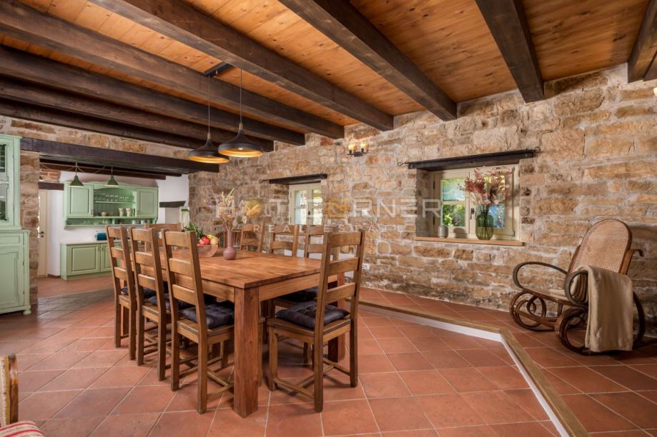 U prizemlju vile središnje mjesto zauzima prostrani dnevni boravak s otvorenim kaminom, uređen u elegantnim smeđim tonovima. Drvene grede na stropovima i kamen na zidovima nastavljaju se iz dnevnog boravka u blagovaonicu i prostranu kuhinju. Velika staklena vrata vode na terasu koja je okružena pomno uređenim vrtom. Na terasi se nalazi lounge odjeljak koji je okružen mirisnim biljem, te ljetna kuhinja s blagovaonskim stolom i bazen okružen sunčalištem. U uređenju vanjskog prostora naglasak je stavljen na istarsku tradiciji, kamen je korišten za ograđivanje okućnice dok su u nadstrešnici korištene drvene grede. Vila ima tri spavaće sobe, i svaka ima svoju kupaonicu. Jedna spavaća soba je smještena u prizemlju, kao i toalet. Unutarnje stepenice vode na prvi katu gdje se nalazi 2 spavaće sobe koje imaju izlaz na natkrivene prostrane terase. S terasa se pruža panoramski pogled na netaknutu prirodu i more.