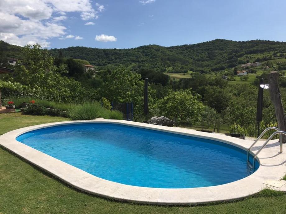 Okućnicom dominira veliki bazen od 32 m2 , sadržaji za djecu, vrt, roštilj, natkrivena terasa te parking za 7 automobila.