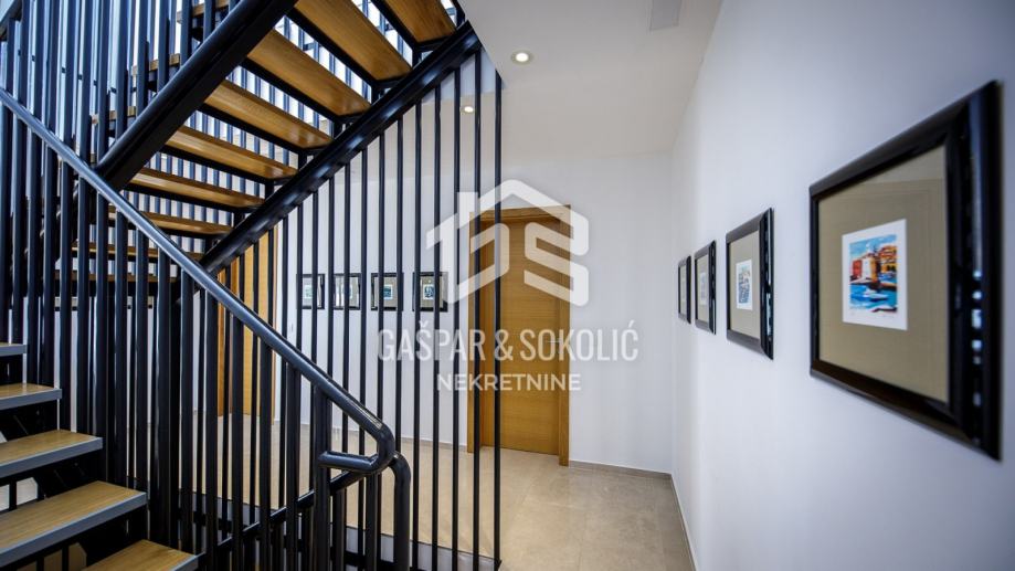 Prizemlje se sastoji od ulaznog hola, hodnika, dnevnog boravka, blagovaone, kuhinje, kupaonice, spremišta, kotlovnice, praonice, terase te garaže sa dva parkirna mjesta. Prvi kat se sastoji od hodnika, 4 sobe, svaka sa vlastitom kupaonicom, te terase. U potkrovlju se nalazi hodnik i spremište, te krovna terasa.