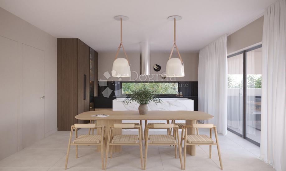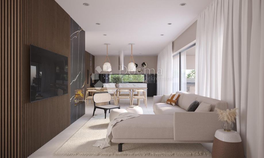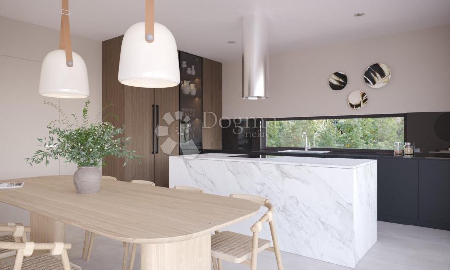 U prizemlju se nalazi jedna spavaća soba s kupatilom, wc, vešeraj , kuhinja s dnevnim boravkom iz koje se izlazi na veliku terasu 31,40m2. Na katu se nalaze tri spavaće sobe svaka sa svojom kupaonom i natkrivena terasa 32m2.