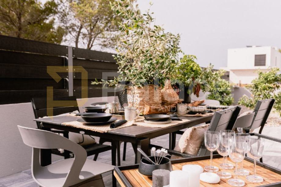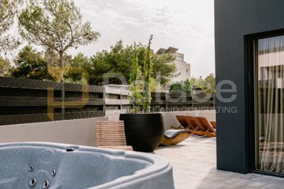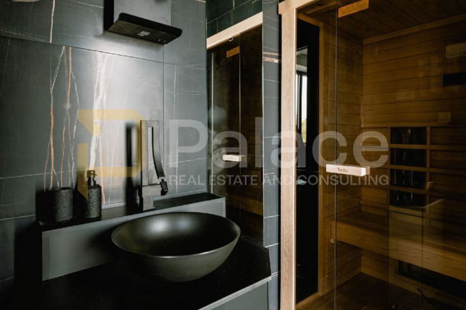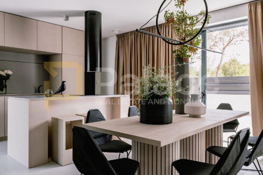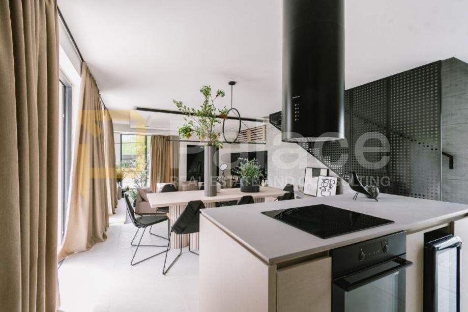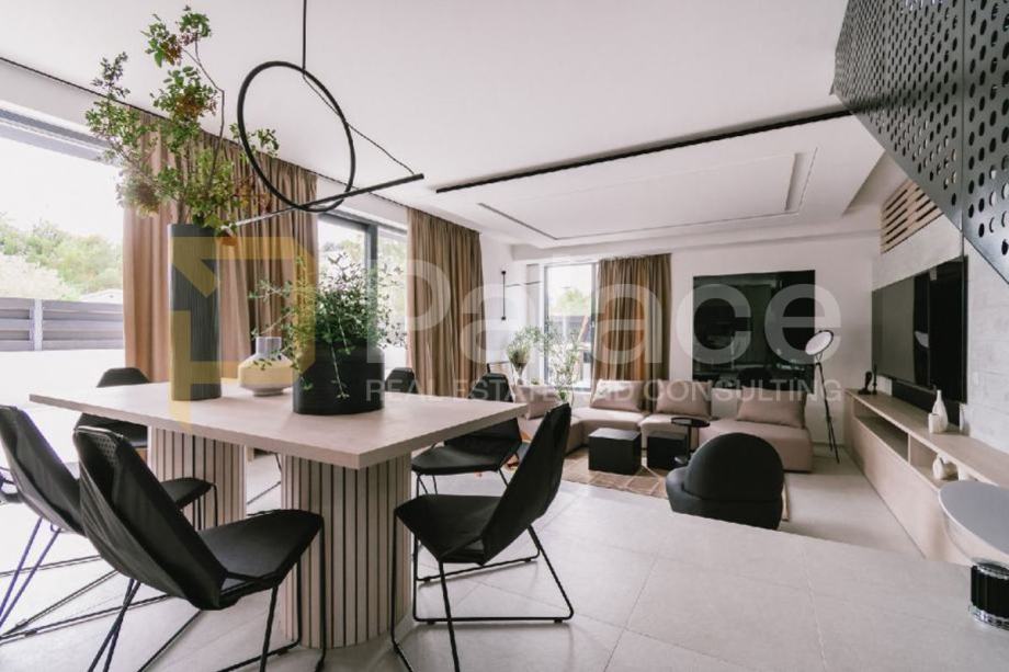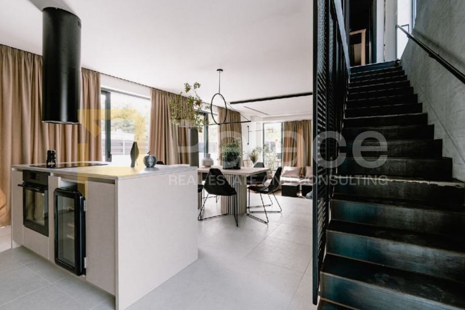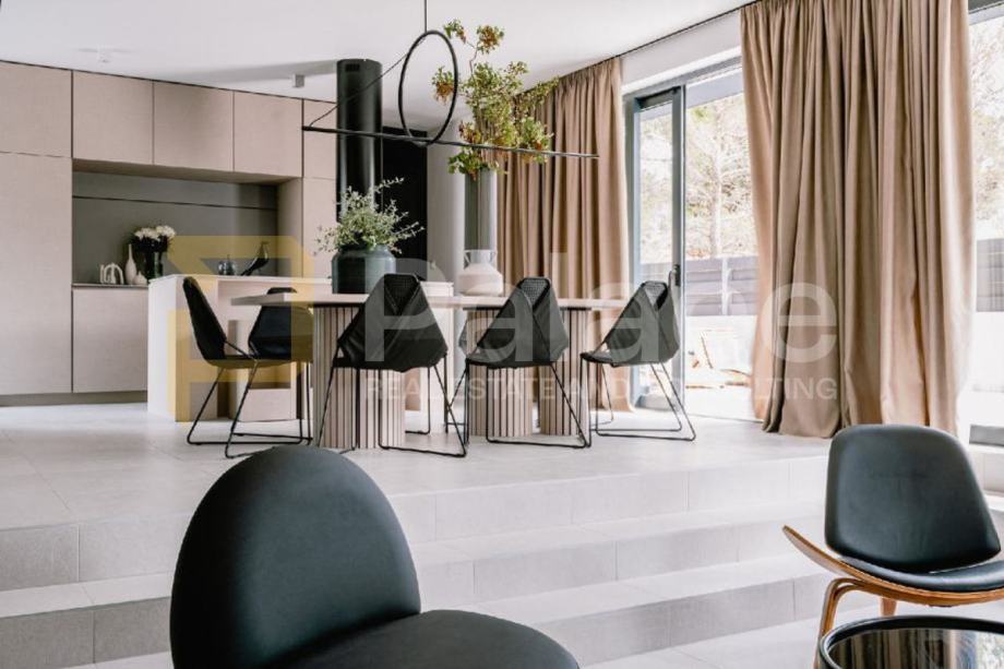 U prizemlju kuće je dnevni boravak te kuhinja i blagovaonica, spavaća soba i kupaonica. Iz istog se pruža izlaz u dvorište gdje se nalazi bazen, jacuzzi, roštilj i vanjski blagovaonski stol.Osim što je kuća izrazito skladno uređena i sazidana modernim materijalima, prevladavaju zemljani tonovi te crna i bijela boja u unutrašnjem uređenju. U svaki detalj ove kuće uložena je posebna briga, a posebno valja istaknuti bazen i jacuzzi koji se nalaze u prizemlju.Lokacija kuće odgovarat će svim onima koji traže mir i bijeg od gradske vreve, te onima koji se žele opustiti u mirnom okruženju ili pak vanjskom "lounge" prostoru.