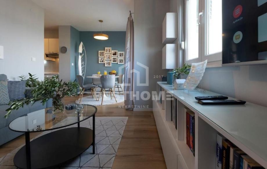 Stan se sastoji od dvije spavaće sobe, dnevne sobe s pridruženom kuhinjom i blagovaonicom, kupaonice i lođe s pogledom na murterski arhipelag, mjesto Murter i Betinu. Pripada mu i prostrano spremište u podrumu zgrade te jedno parkirno mjesto ispred zgrade. Kompletno je renoviran i novonamješten u razdoblju od 2021. do 2024. te se tako uređen prodaje s namještajem te svom pripadajućom kuhinjskom tehnikom i perilicom rublja. Stan je također opremljen inverterskim klima uređajem i norveškim BEHA grijanjem. Nalazi se na prvom katu zgrade i od ulaza ga dijeli svega par stepenica. Turistički je kategoriziran s 4 zvjezdice i ima uhodani biznis ljetnog iznajmljivanja te može biti i dobar izvor dodatne zarade kada se ne boravi u njemu. Pogodan je cijelogodišnji boravak.
