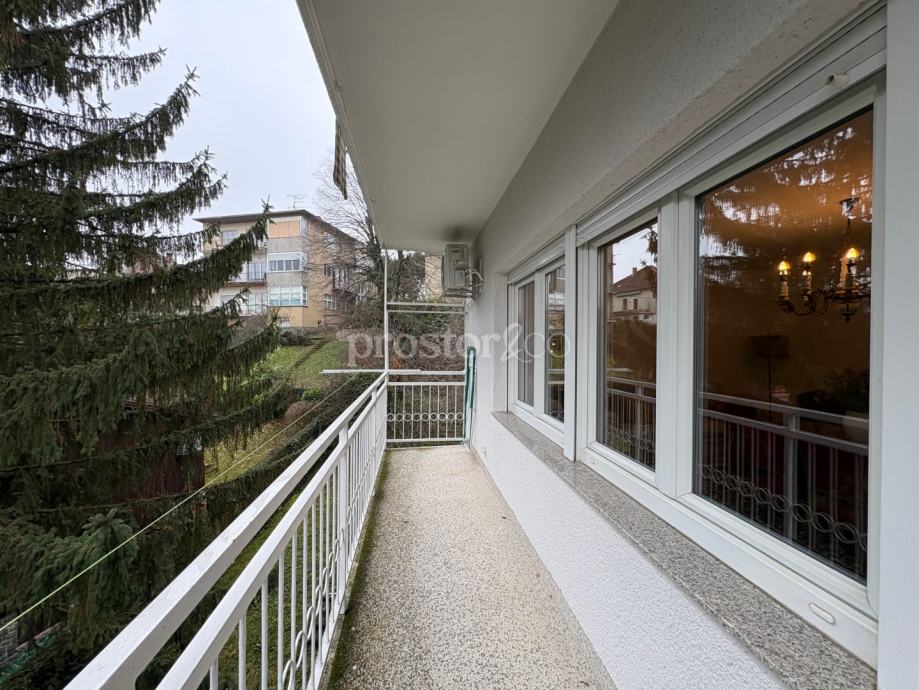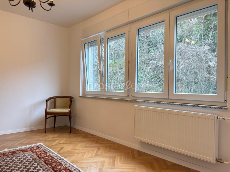 Blagovaonica je posebno šarmantna – uređena s dijelom originalnog, starog namještaja koji je pažljivo uklopljen s modernim detaljima dodanima tijekom renovacije, stvarajući toplu i uglađenu cjelinu. Prostrani dnevni boravak izlazi na veliki balkon koji se proteže duž cijele prostorije, pružajući obilje prirodnog svjetla, ali i potpunu privatnost jer se s druge strane nalazi samo zelenilo i mir ove prestižne lokacije.