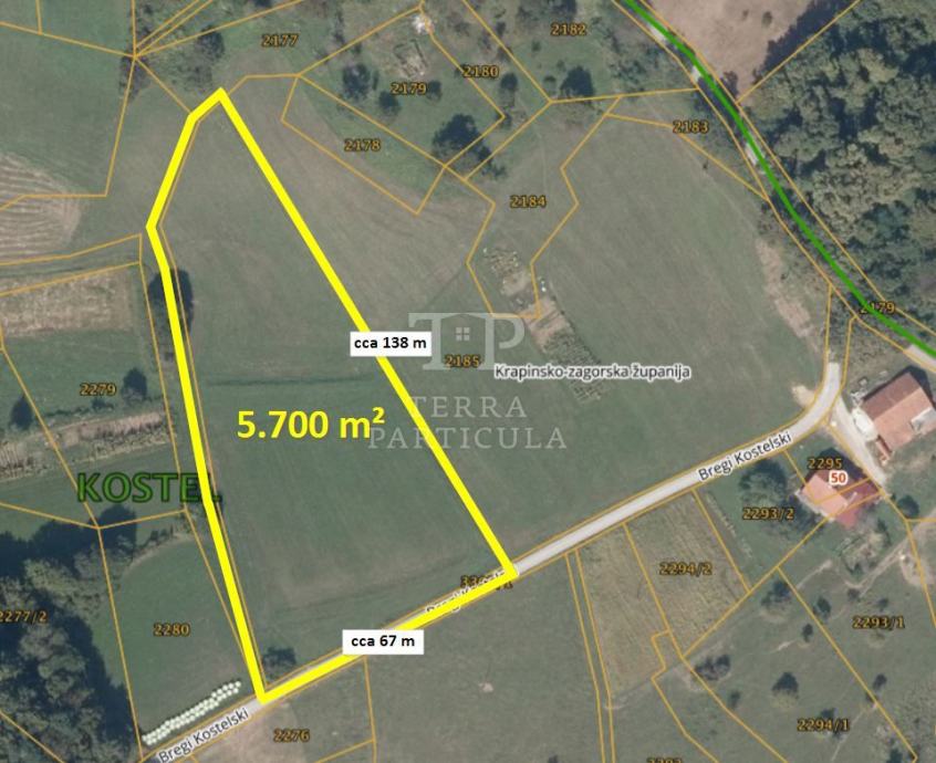 Na prodaju nudimo zemljište od cca 5.700 m² pogodno za gradnju obiteljske kuće ( u tijeku je izmjena prostornog plana) je. Vlasništvo je čisto, 1/1 bez tereta. Ponuđeno se nalazi uz kuću na adresi Bregi Kostelski 50.