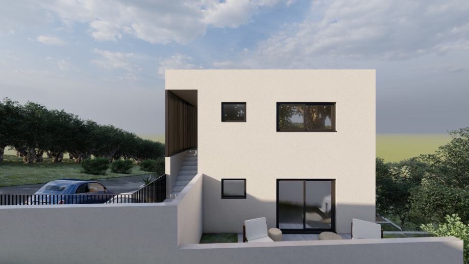 Stan se nalazi u manjoj stambenoj zgradi s ukupno tri stana. Zgrada je smještena na mirnoj lokaciji oko 400m od mora.