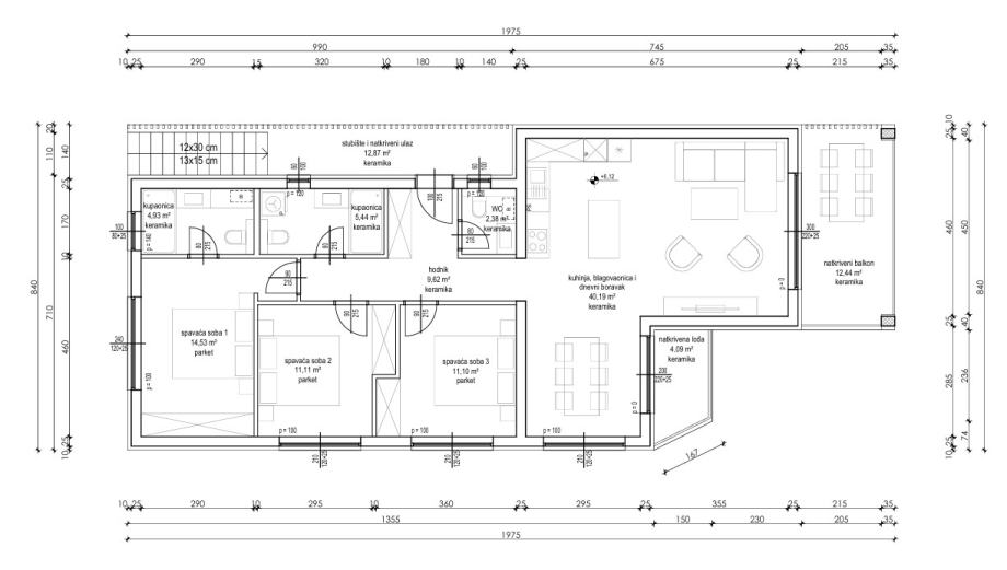 Iz dnevnog boravka se izlazi na natkrivenu terasu površine 12,44m2, uz nju postoji i loggia s izlazom iz dnevnog boravka površine 4,09m2.
