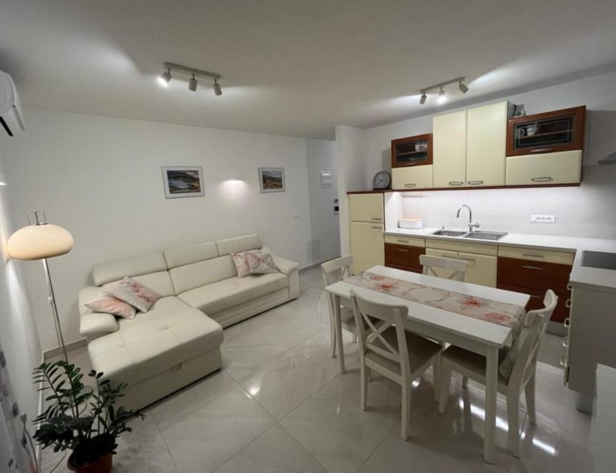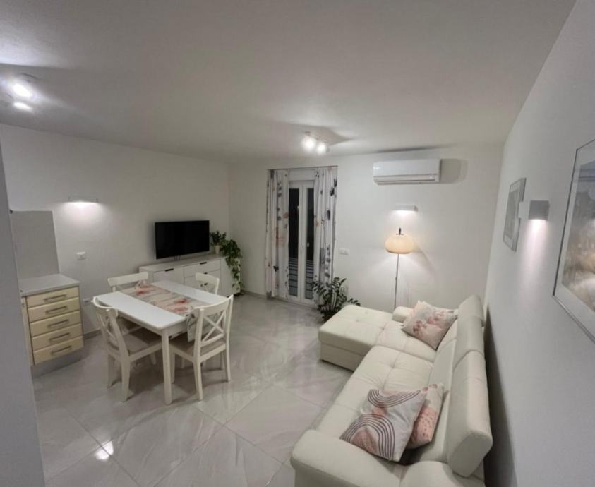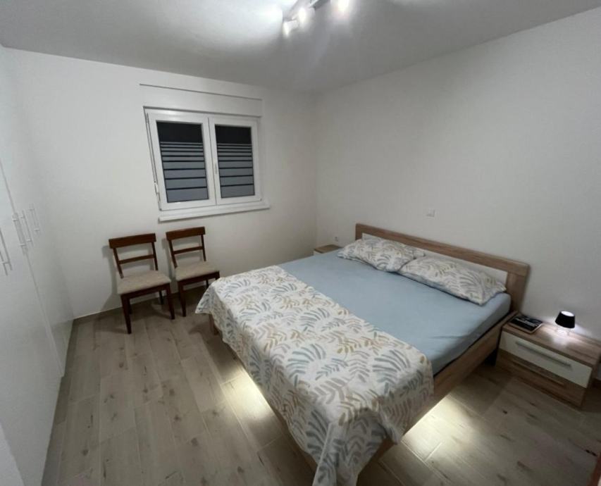 Ovaj prekrasan stan na 1.katu manje, novije zgrade kvalitetne gradnje vjerujemo da će zadržati vašu pažnju. U 64m2 površine smjestili su se dvije spavaće sobe, hodnik, kuhinja s blagovaonom i dnevnim boravkom, kupaonica i lijepa, prostrana terasa sa koje se dijelom vidi more. Stan je od mora udaljen cca 900m, namješten je, opremljen, klimatiziran, a električno podno grijanje (dnevni boravak i kupaonica) sigurno je jedna od prednosti. U vlasništvu je parkirno mjesto koje se nalazi pored zgrade.