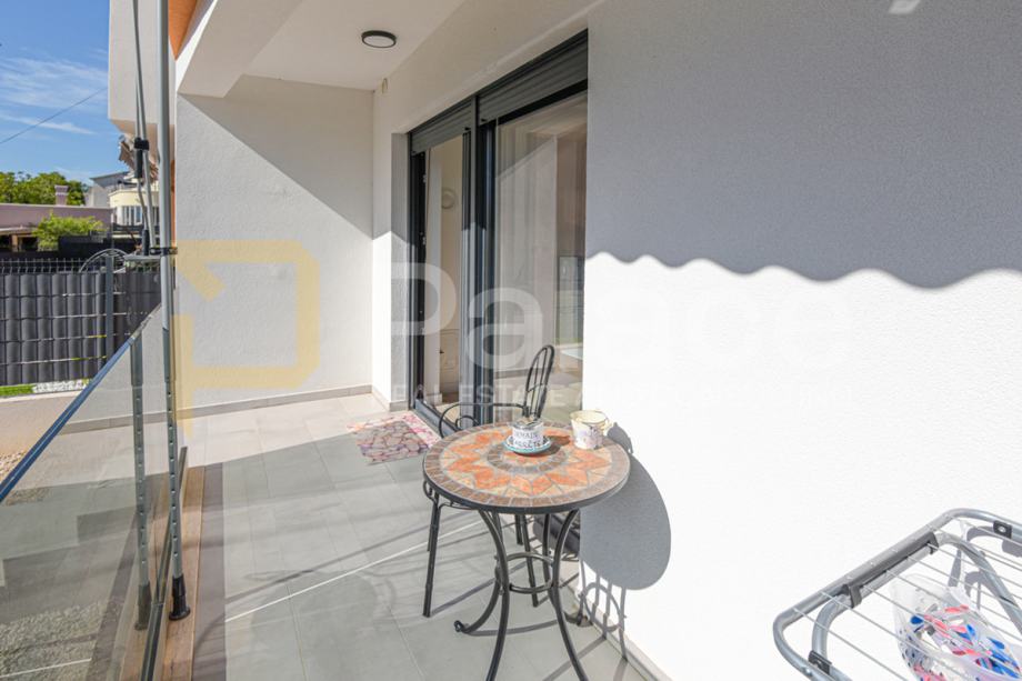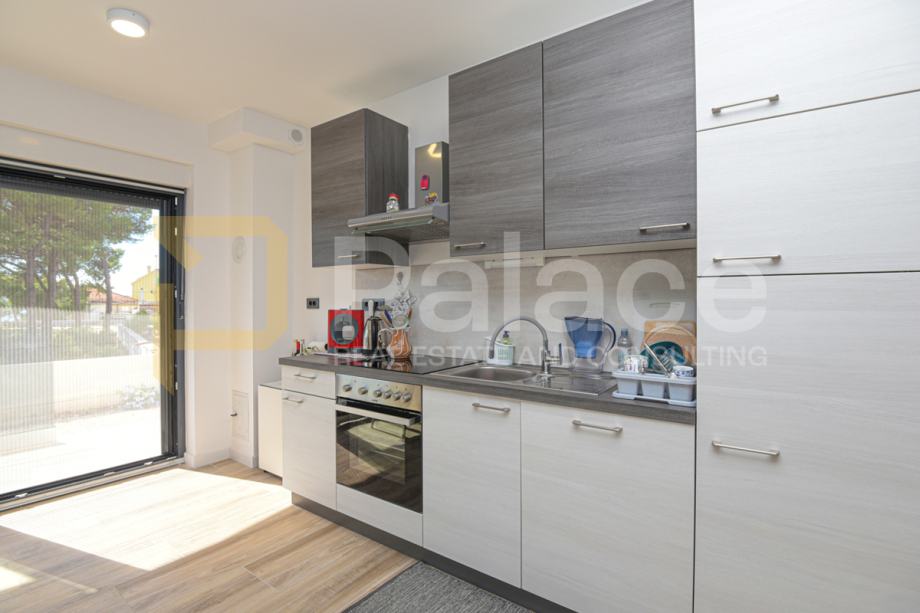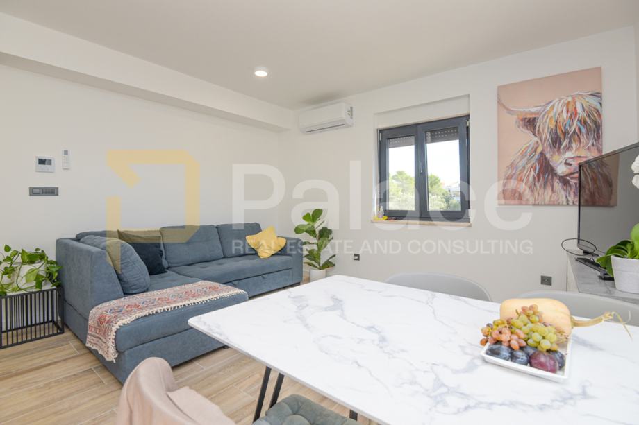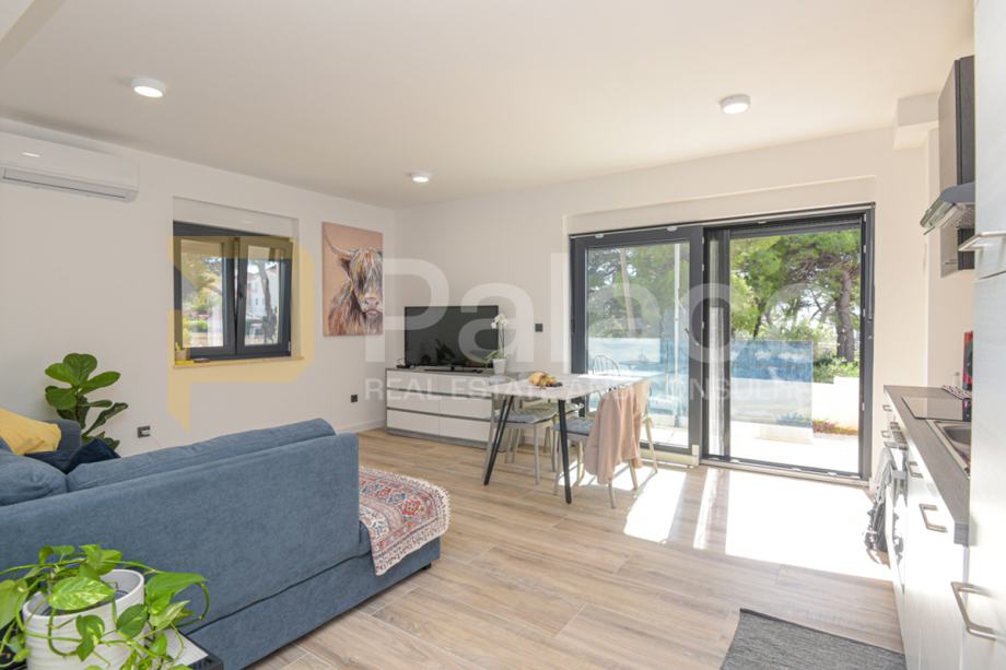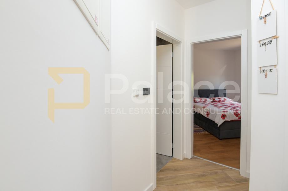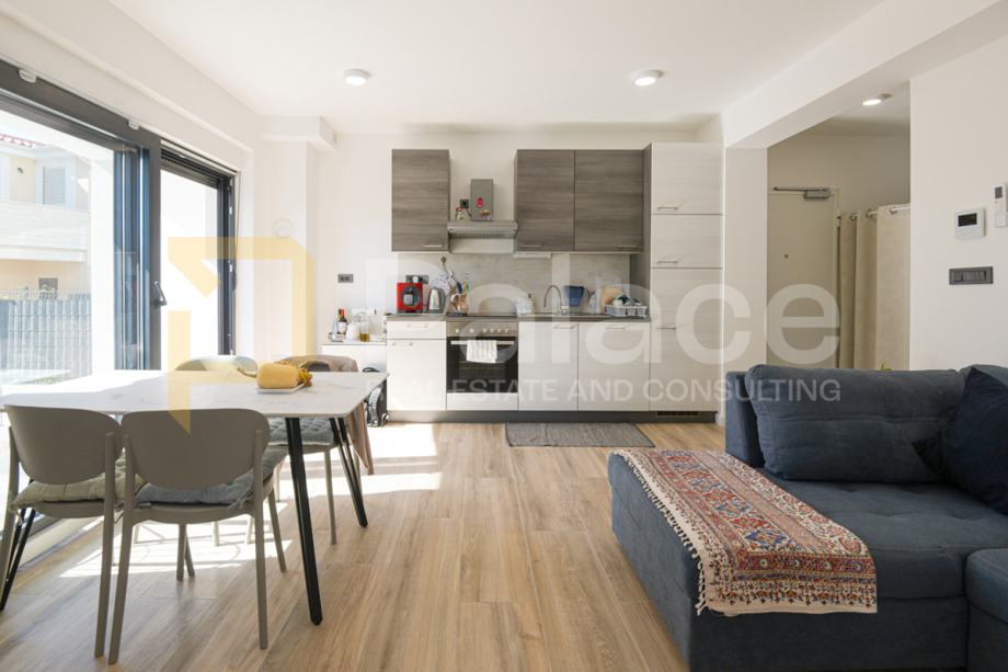 Stan se nalazi u prizemlju nove zgrade, a sastoji se od predsoblja, dvije spavaće sobe od kojih jedna ima svoju kupaonicu i dodatno još jedna kupaonica, kuhinje s dnevnim boravkom i izlazom na osunčanu terasu s pogledom na more. S terase se silazi u vrt. Stan raspolaže jednim vlastitim parkirnim mjestom.