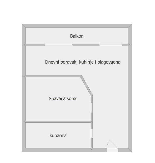 Stan se sastoji od dnevnog boravka u sklopu kuhinje i blagovaone, jedne spavaće sobe, kupaone, hodnika i balkona.