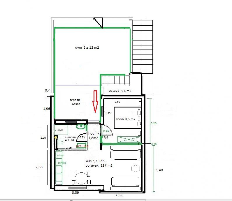 Drugi apartman (u prizemlju) ima 30 m2 + 7m2 natkrivene terase + 2m2 ostave
