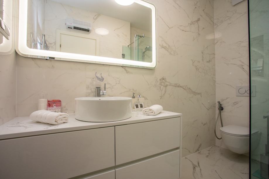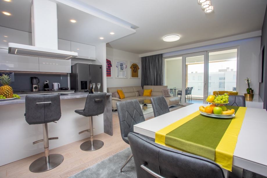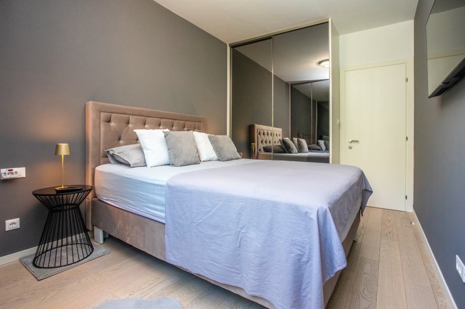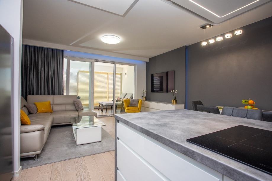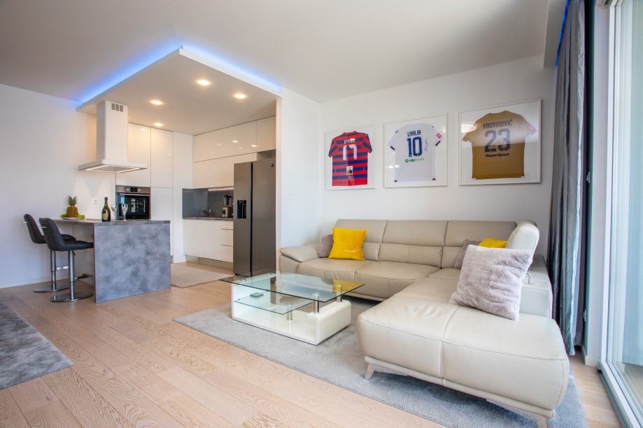 We are renting a beautiful modern two-bedroom apartment located in the famous Morske Vile. The apartment is located on the second floor of a new building with an elevator. It has 86m2, two bedrooms, a bathroom and toilet, a kitchen with a dining area and a large living room with access to a beautiful loggia with sun loungers and a sea view. The apartment also has a closed garage with two parking spaces. The apartment is available for rent now for long term for price €2000 or short term untill 1.6.2026. at a price of € 1300 per month. More additional info on CONTACT: 0915616295 (ANDREA)