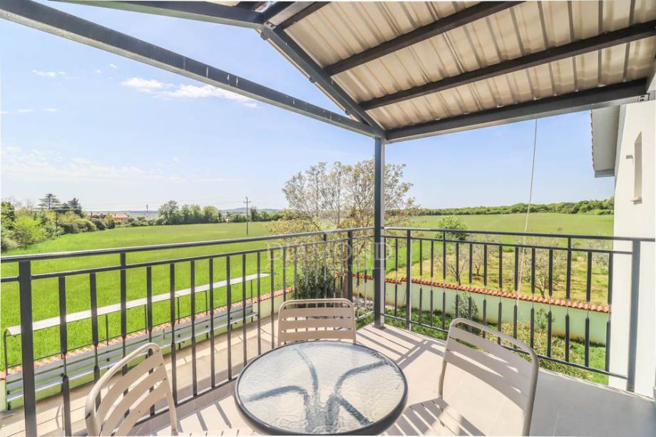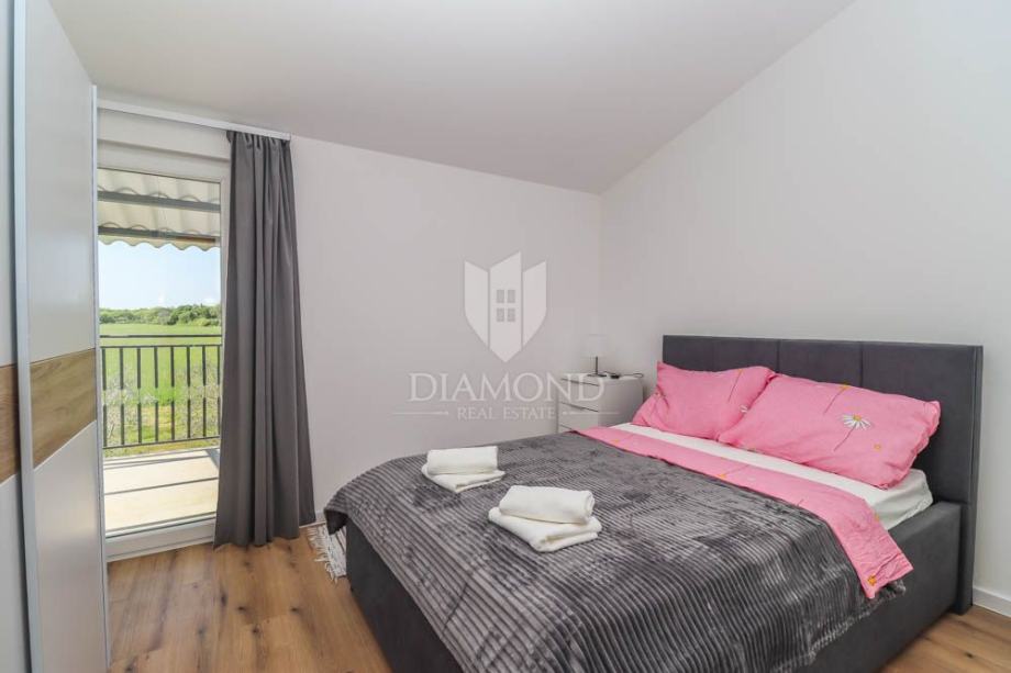 Ovaj stan se smjestio na prvom katu. Stan je kompletno renoviran i moderno opremljen. Sastoji od otvorenog prostora koji dijele dnevni boravak sa kuhinjom i blagovaonicom i izlazom na terasu. U nastavku se nalaze dvije spavaće sobe sa izlazom na prostranu terasu sa pogledom na zelenilo te kupaonica i gostinjski wc. Ukupna kvadratura iznosi 85m2. Uz stan dolazi vrt na korištenje sa bazenom te natkriveno parking mjesto.