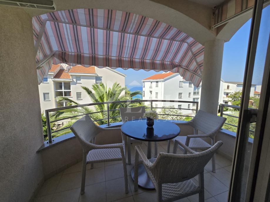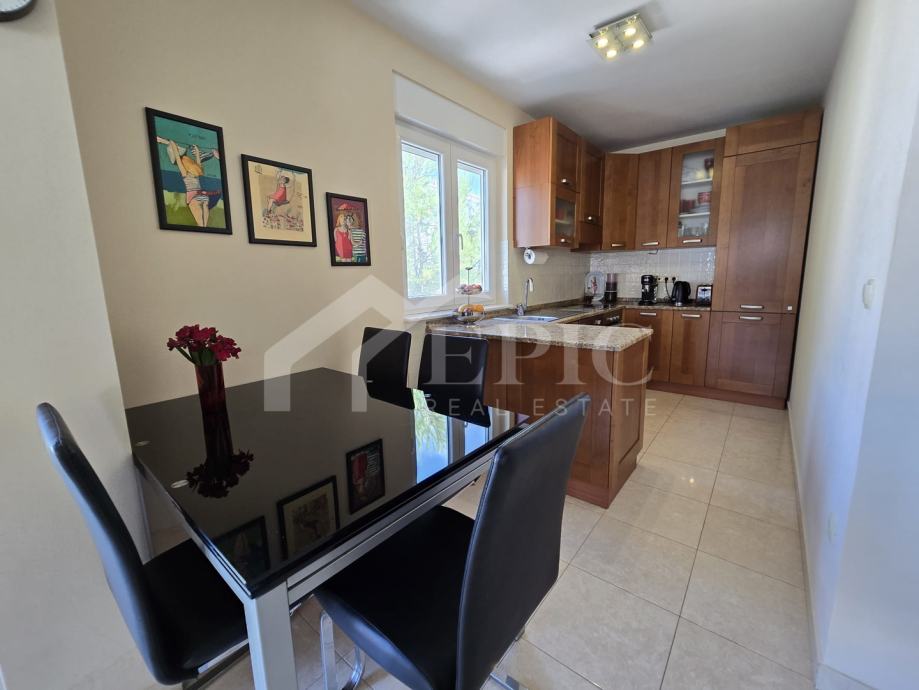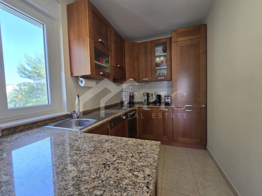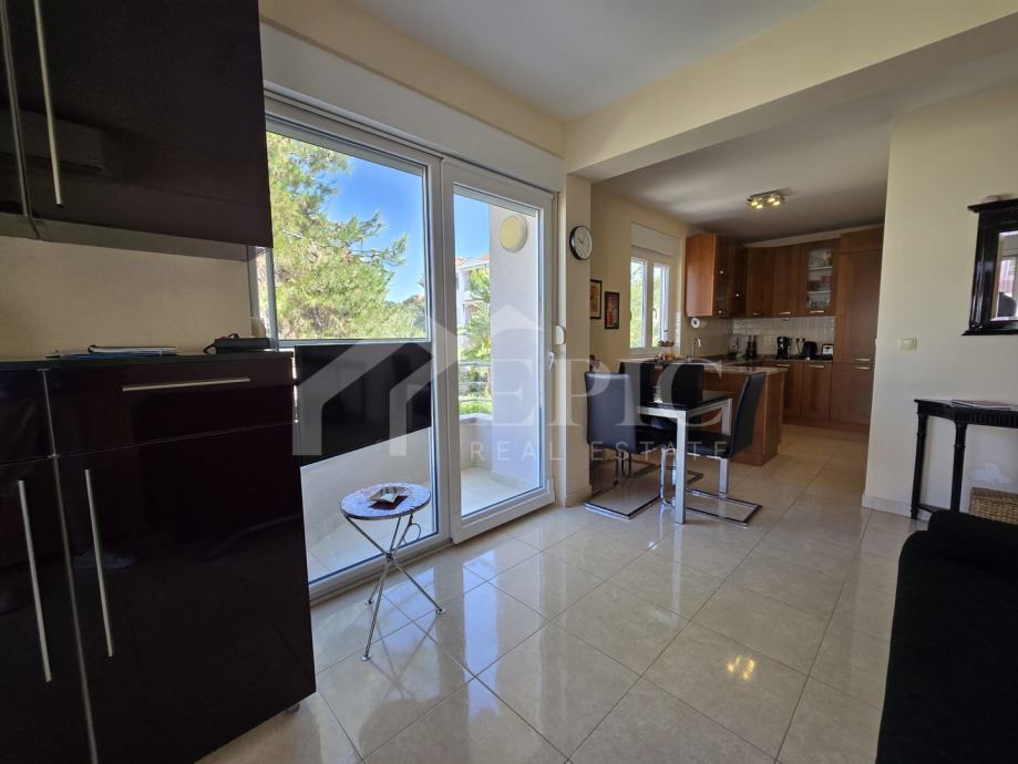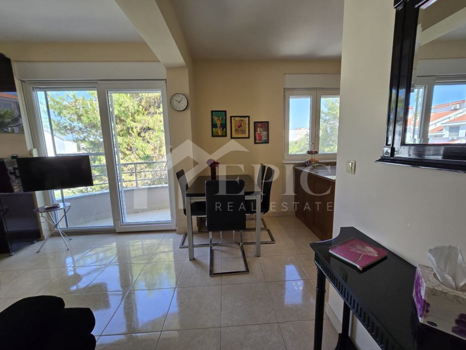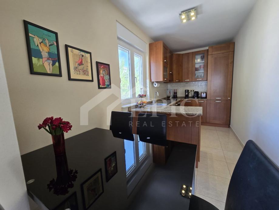 Dnevni boravak nudi ugodan ambijent za opuštanje, povezan s blagovaonicom i kuhinjom, stvarajući otvoren i funkcionalan prostor za svakodnevni boravak. Izlaz na balkon i lođu dodatno proširuje životni prostor te omogućuje uživanje u pogledu i svježem morskom zraku. Klimatizirana spavaća soba pruža mir i privatnost, dok kupaonica zadovoljava sve potrebe za udobnim boravkom.