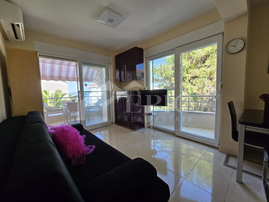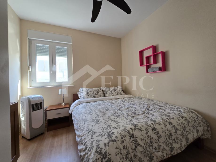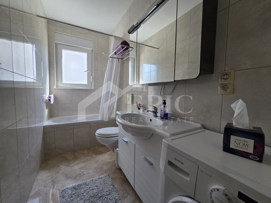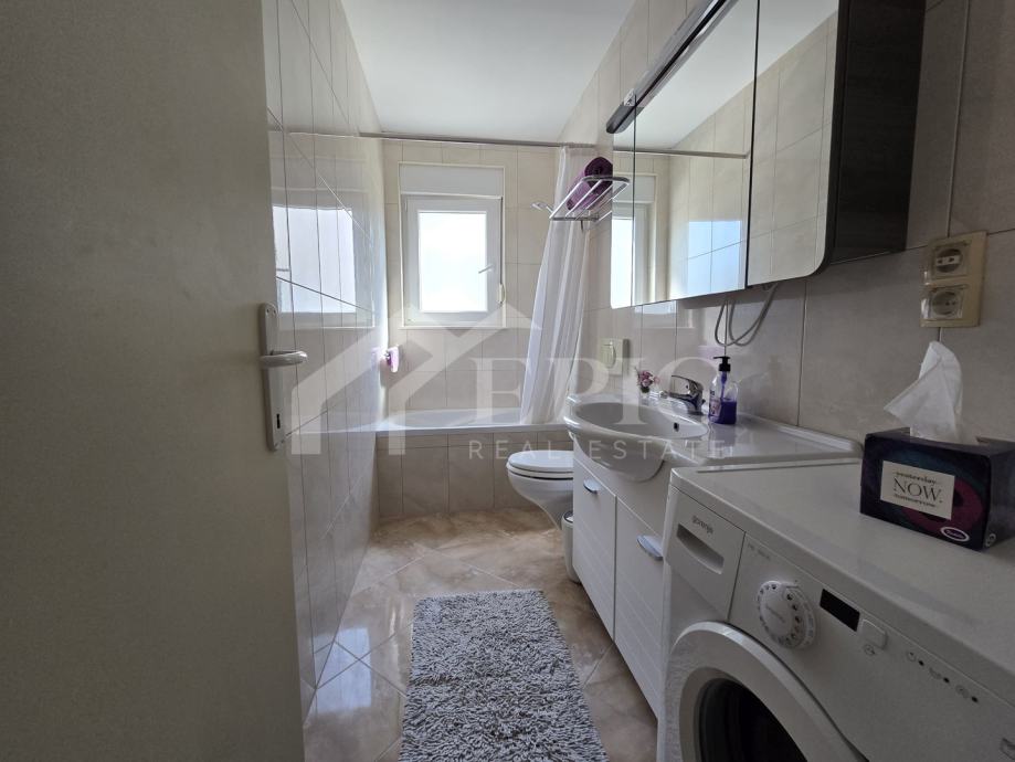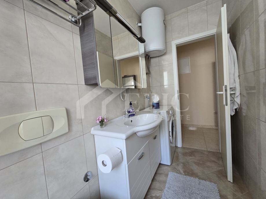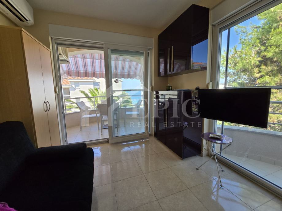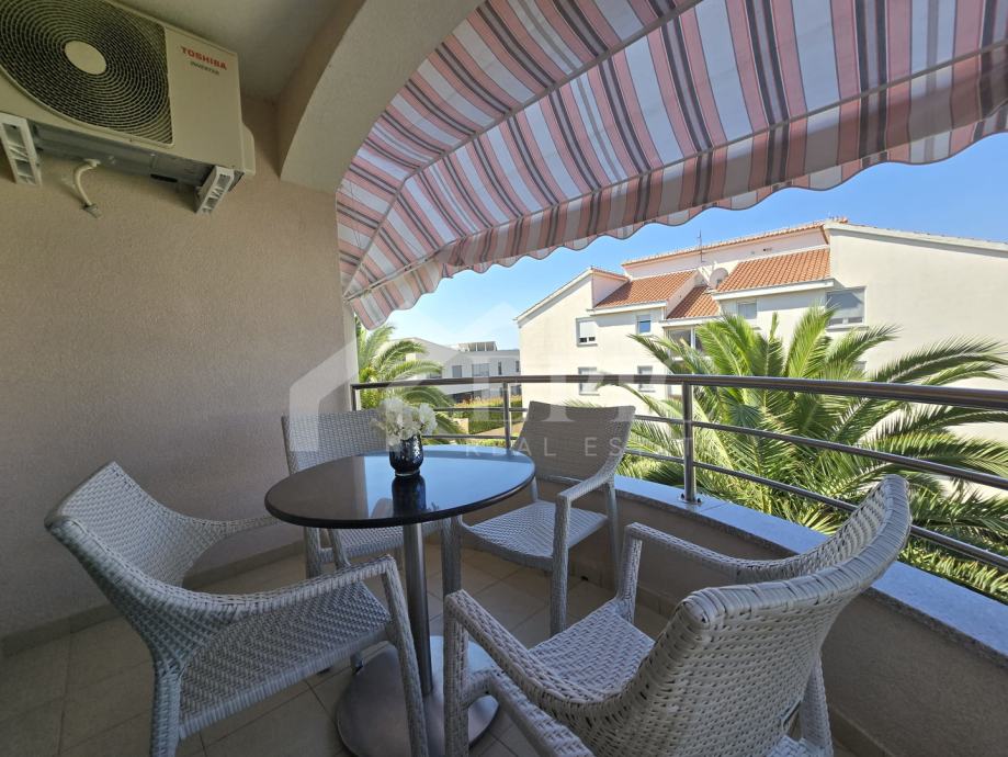 Dnevni boravak nudi ugodan ambijent za opuštanje, povezan s blagovaonicom i kuhinjom, stvarajući otvoren i funkcionalan prostor za svakodnevni boravak. Izlaz na balkon i lođu dodatno proširuje životni prostor te omogućuje uživanje u pogledu i svježem morskom zraku. Klimatizirana spavaća soba pruža mir i privatnost, dok kupaonica zadovoljava sve potrebe za udobnim boravkom.