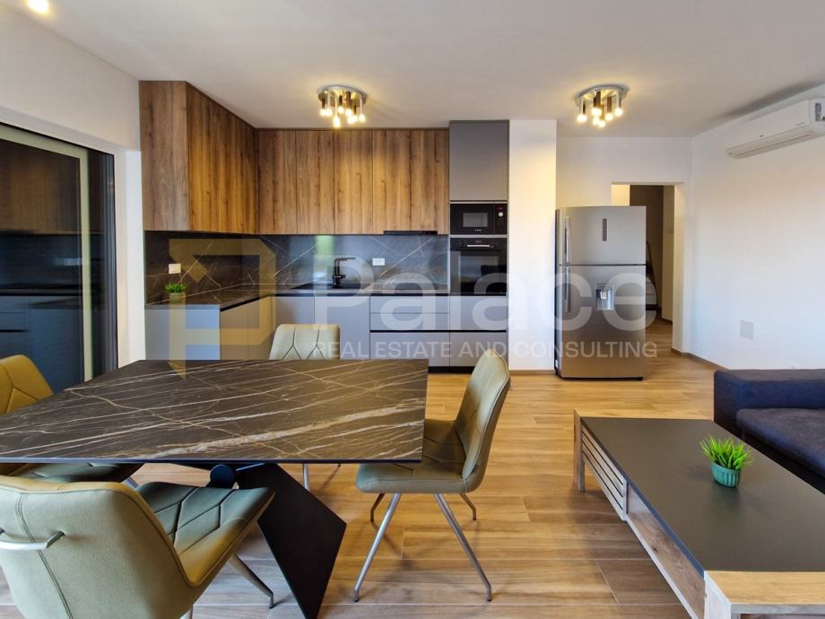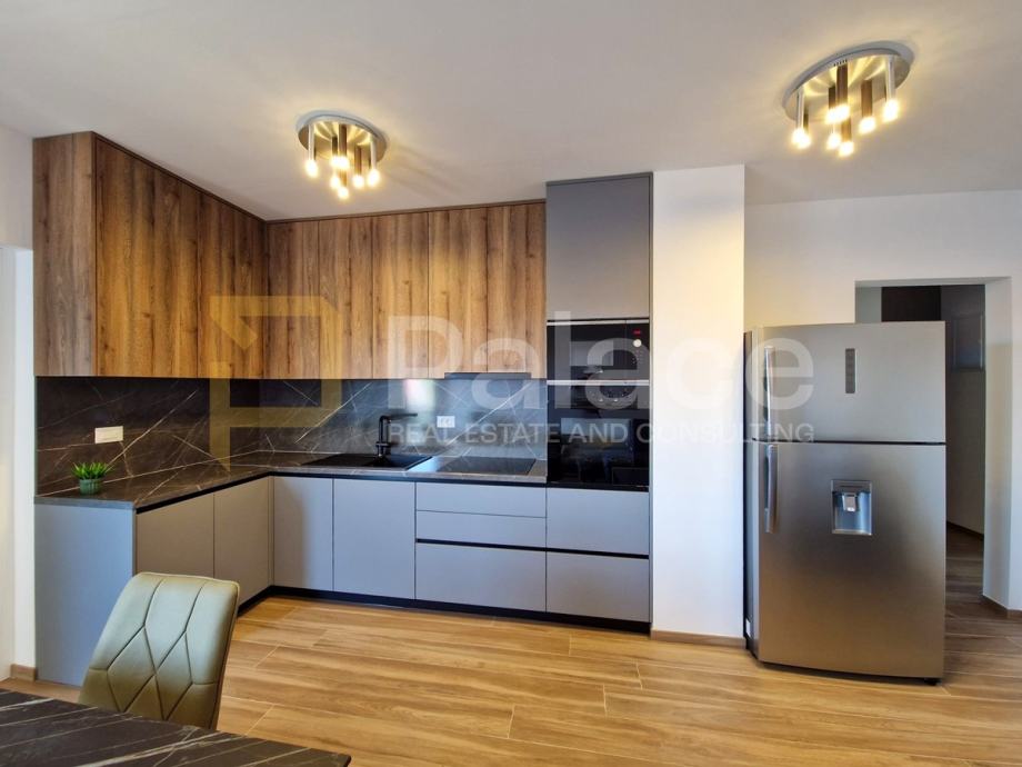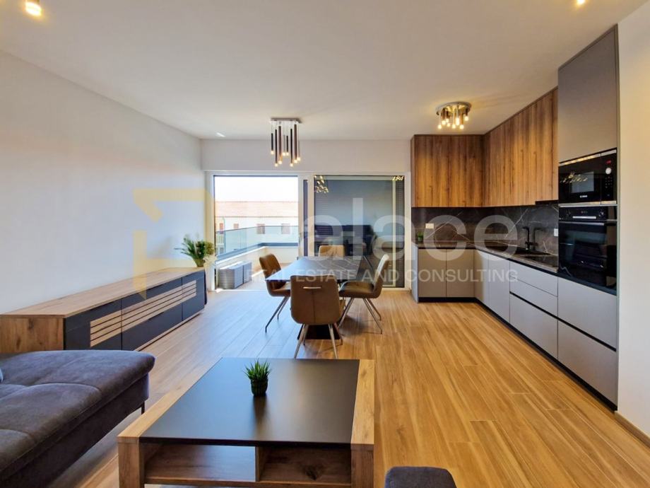 Stan se sastoji od prostranog predsoblja s velikim zidnim ormarom, kupaonice, open space kuhinje, blagovaonice i dnevnog boravka. Ima dvije spavaće sobe, od kojih jedna ima izlaz na terasu i vlastitu kupaonicu.