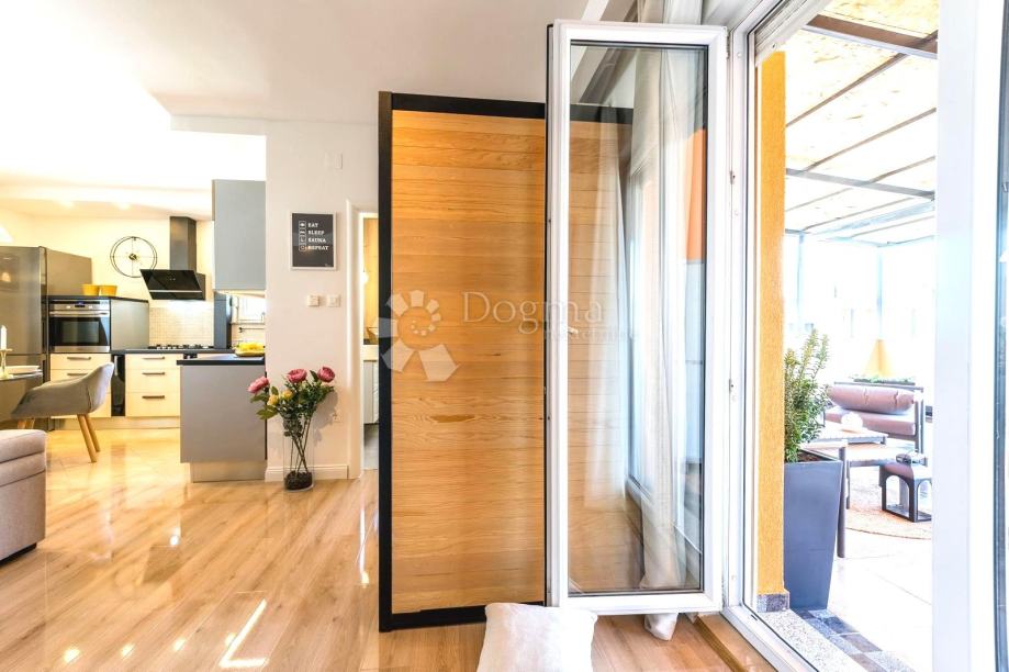 Prostire se na 57 m² stambenog prostora (s obračunatim koeficijentom), a sastoji se od ulaznog prostora, kuhinje s blagavaonicom- prostranog dnevnog boravka s izlazom na prekrasnu terasu od čak 35 m² s koje se pruža panoramski pogled na grad,